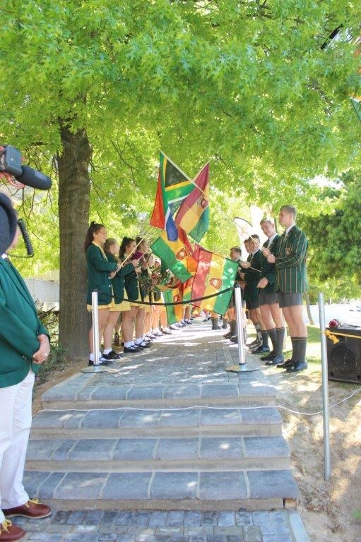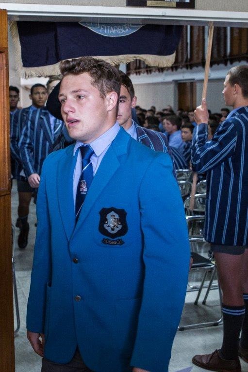 Hier staan die graad 8- 11 leerders van Hoër Jongenskool Paarl erewag terwyl die matrieks by hek uitstap.