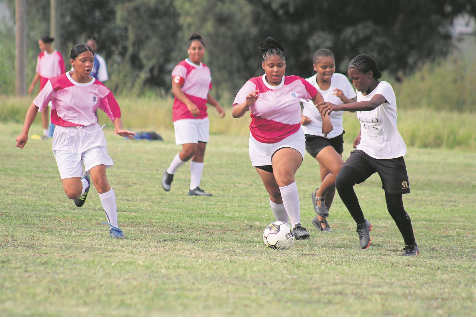 New Orleans Sekondêr en Bergrivier Sekondêr se meisies het mekaar op die sokkerveld die stryd aangesê. New Orleans het die wedstryd 1-0 gewen.Foto: Ernest Kilowan