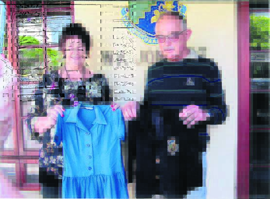 Hennie Gerber van die Paarl het onlangs sy en sy suster se ou skoolklere van baie jare gelede in sy ouerhuis gevind en geskenk aan die laerskool waarin hulle destyds was, Laerskool WA Joubert. Links oorhandig Gerber die klere aan die skoolhoof, Leticia le Roux. Die skool sal die uniforms uitstal as deel van sy geskiedenisversameling.Foto: