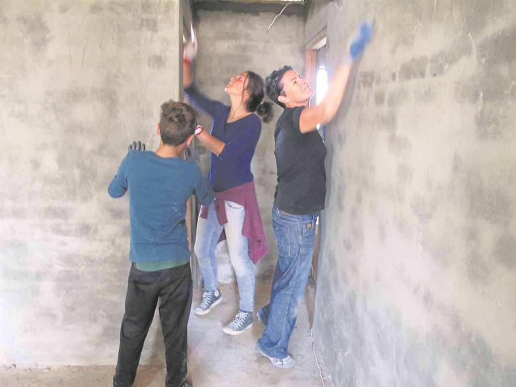 Helpende hand: ’n Groepie jong helpers uit Duitsland besig om die binnekant van een van die nuwe huise af te pleister. Foto’s: Johan nel
