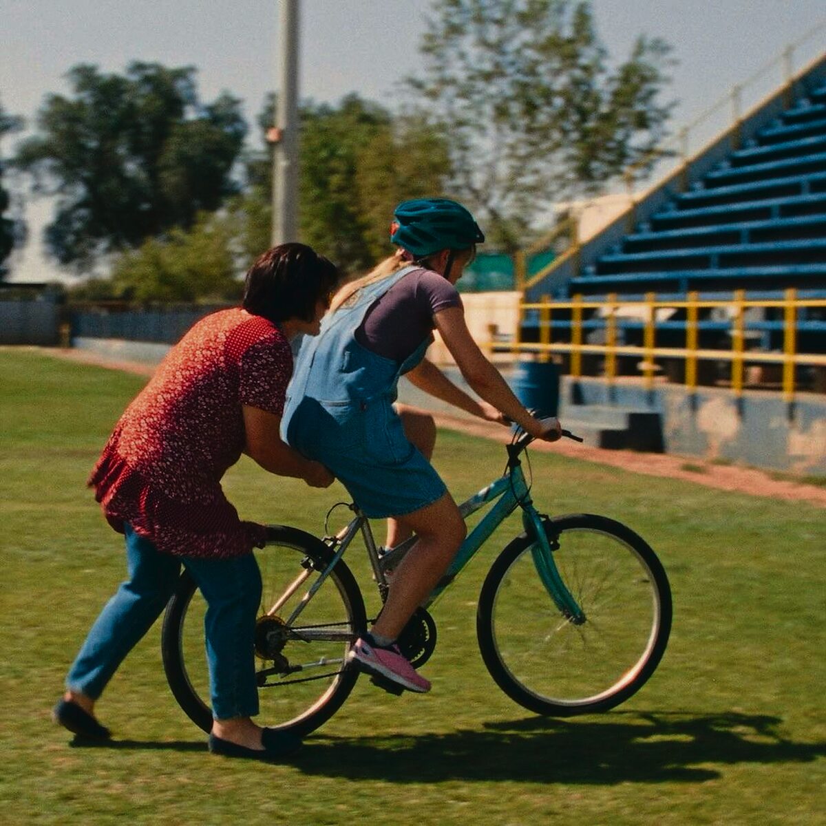 Je-Ani Swiegelaar (as Heidi Theron) stoot vir Zandélle Meyer (as Marelize Theron) terwyl sy probeer fietsry. Foto: Silwerskermfees/ webtuiste