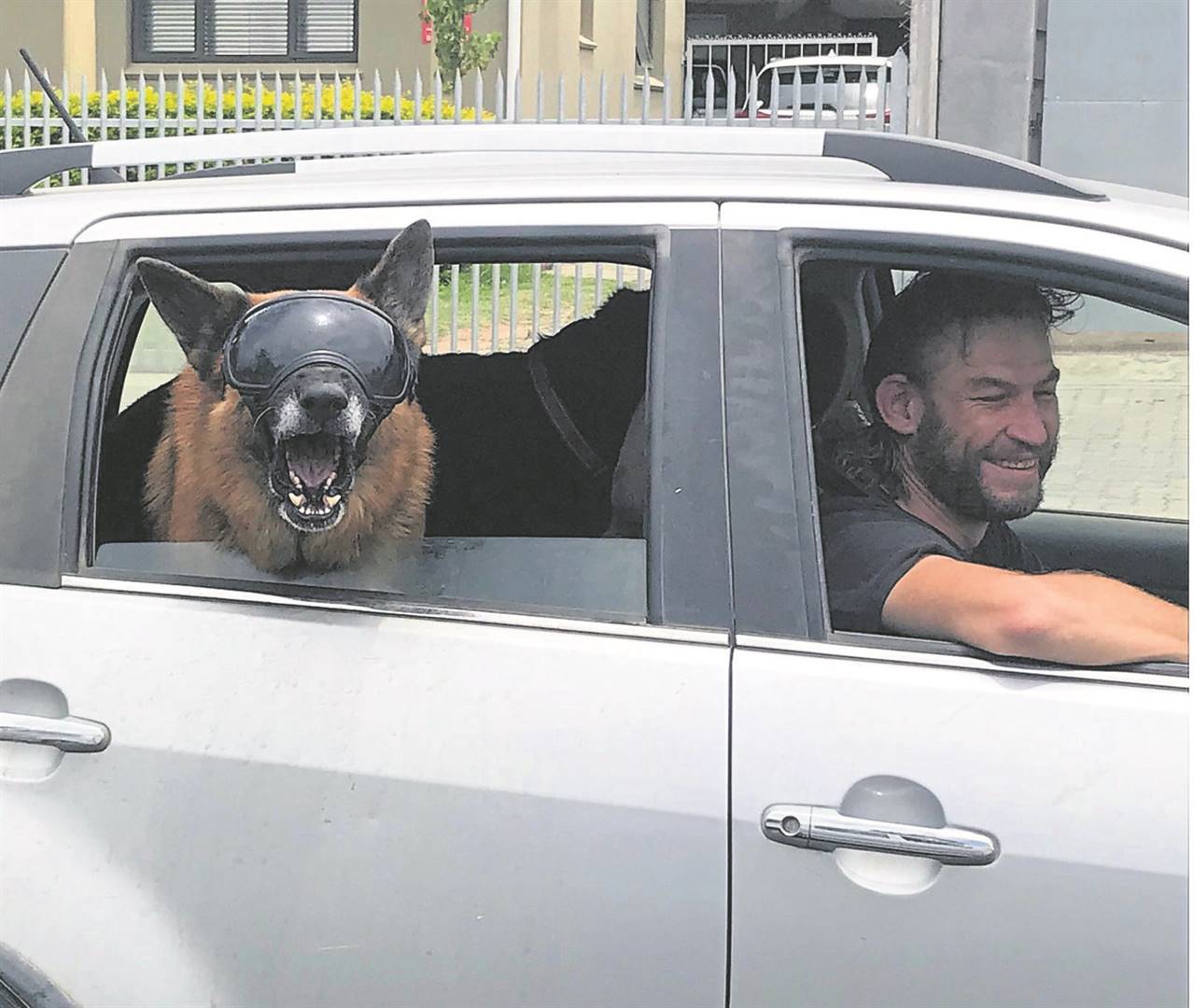Hierdie honde-passasier is so gretig om tydens ’n rit uit die motorvenster te loer dat sy eienaar vir hom ’n motorfietsbril aangeskaf het om te keer dat muggies en dies meer in sy oë beland. Wagter is Sondag raakgesien terwyl hy en sy baas in die Bergrivier Boulevard gery het.Foto: Lise Beyers