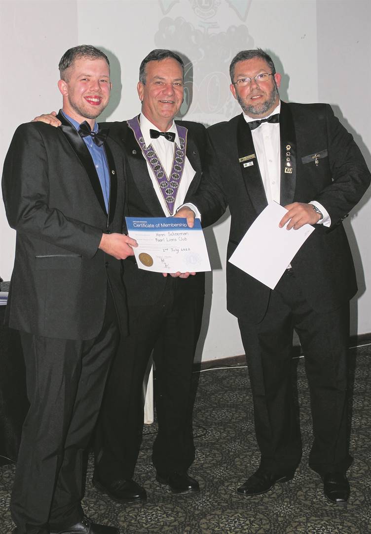 Tydens Paarl Lions se formele dinee is ’n nuwe lid, Henri Schoeman (links) ingelyf. Hy is deur Mark Kaufman (president) en Johann Smith (streekvoorsitter) geluk gewens. Mark is ook by die geleentheid as Paarl Lions se nuwe president ingehuldig.Foto: