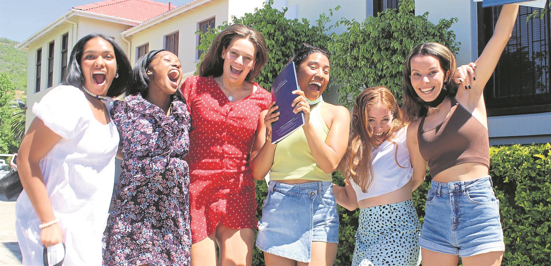 Die klas van 2021 van die Hoër Meisieskool La Rochelle was oorstelp van vreugde oor die skool se 100%-slaagsyfer. Octavia Lawrence, Isha Govender, Leigh Bennett, Tarryn de Wet, Hayley Eastment en Alix Moore wys hul opgewondenheid kort nadat hulle hul uitslae ontvang het. Foto: Liezl Davids