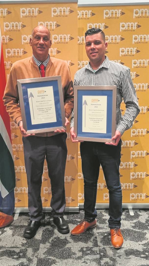 Die Paarlse veiligheids­maatskappy PACRS (voorheen AC Rottweiller) het verlede week twee Diamond Arrow-eerbewyse by die Wes-Kaapse PMR-prysuitdeling vir uitmuntende diens in die veiligheidsektor ontvang. Die pa- en seunspan van PACRS, Allan (links) en Aldrin Carolissen, is trots op dié eer wat hulle te beurt geval het.
