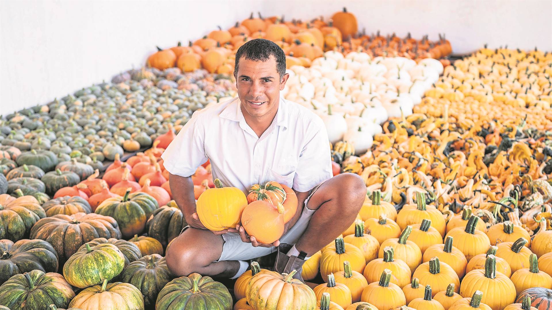 Jy gaan gewis nie ’n vrot pampoen of ’n stukkende skoen by die spog-landgoed Babylonstoren in Simondium aantref nie. Iets wat jy wel sal aantref, is ’n wonderbaarlike tentoonstelling van ’n oorvloed van meer as 30 pampoensoorte in elke denkbare vorm en grootte, wat tans in die Pofadder-gebied van die landgoed uitgestal word. Al die pampoene kom uit Babylonstoren se tuin vir eetbare produkte. Links pronk Darryl Combrinck, Babylonstoren se tuinier, tussen van die plaas se pampoene. Die pampoenuitstalling duur tot volgende week. Die ingangsfooi by die plaas is R10 vir kinders (onder 12 jaar) en R20 vir volwassenes.