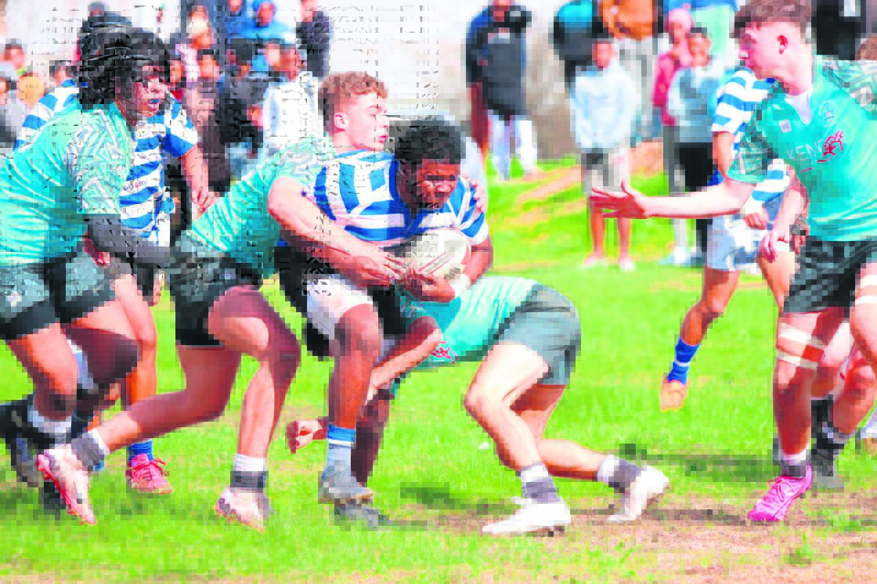 Die Hoërskool Paulus Joubert het Saterdag teen Hutcheson Grammar School van Skotland op Paulus se velde gespeel. Bo is Keenan Pietersen op ’n kragtige stormlopie. Paulus het die Skotte met 33-28 geklop.Foto: Ernest Kilowan