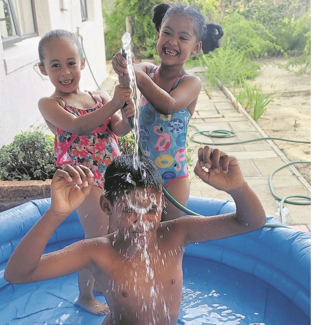 To escape the extreme heat in Paarl this past weekend Aluna Dyson (5), Micah Davids (4) and Cairo Davids (9, front) had some good old fun spraying each other with water in an attempt to cool down. Photo: Liezl Davids