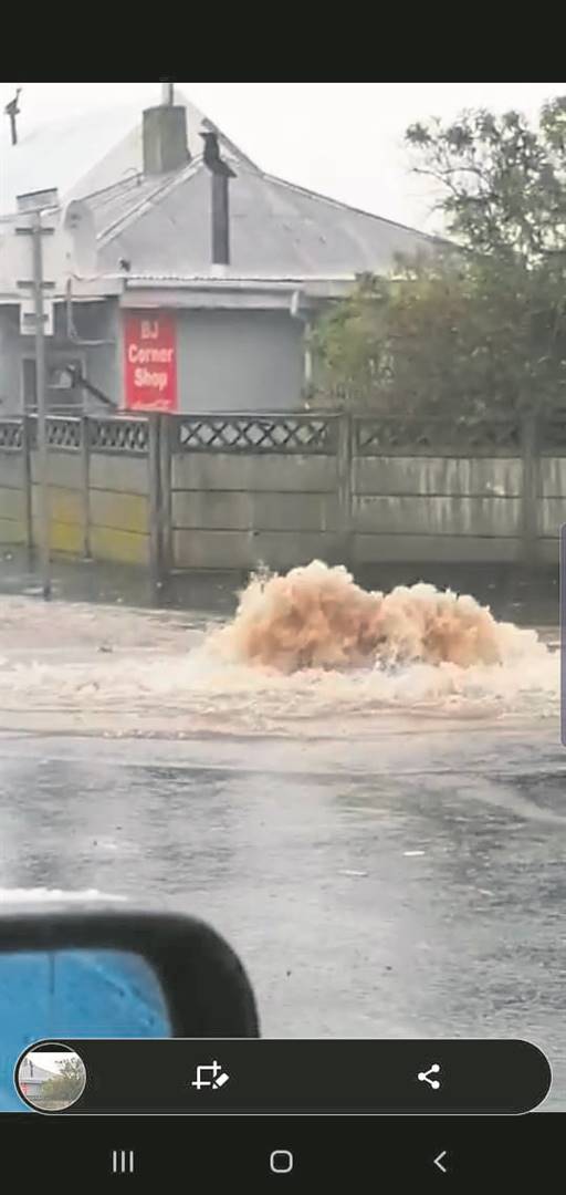 Stormwater het vroeg Donderdag (25 Augustus) terwyl die reën aanhoudend neergestort het, uit ’n mangat by die aansluiting van Annie Benjamin- en Gert Thomasstraat geborrel en pad-af en op die sypaadjie gestroom.