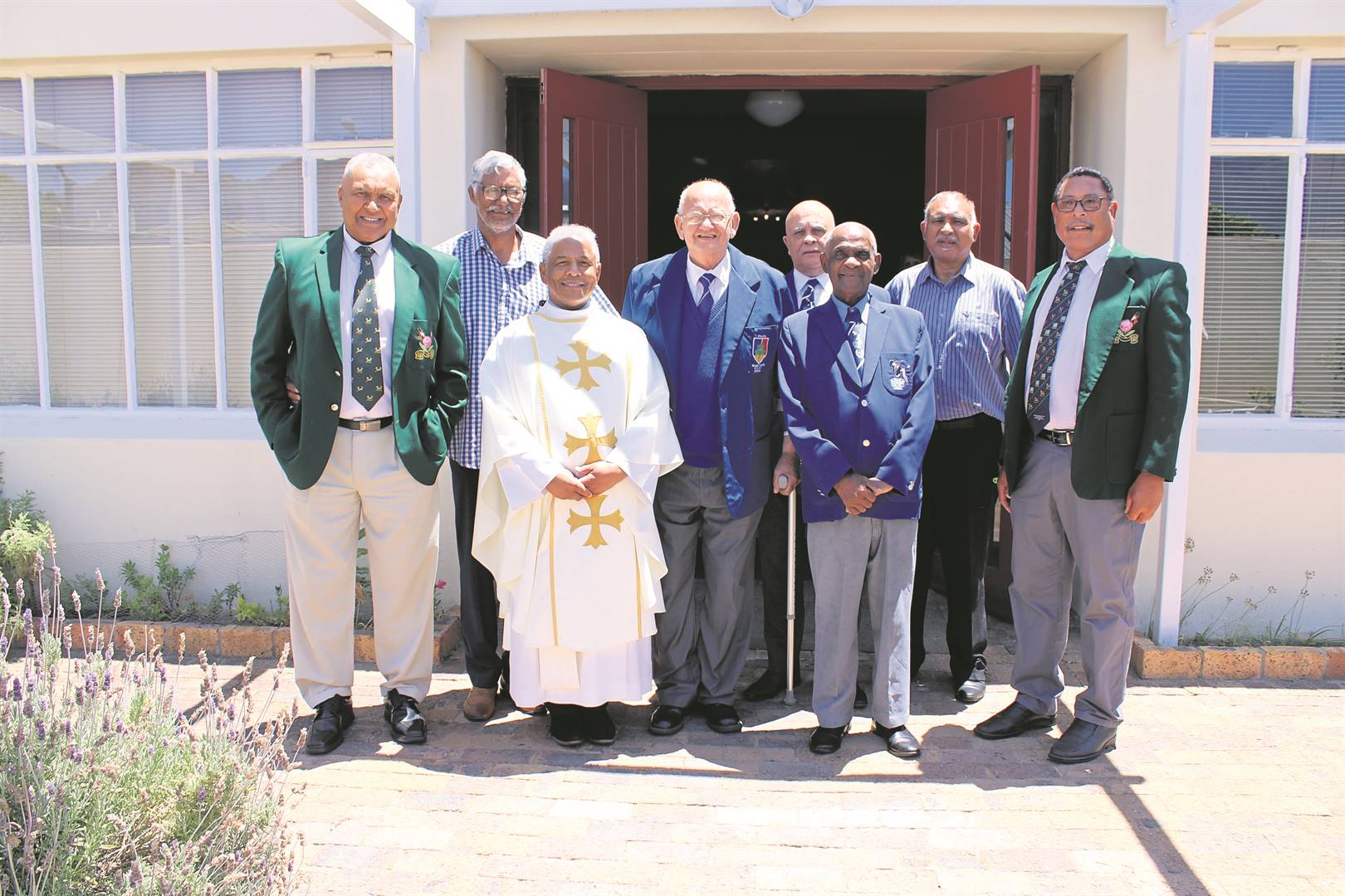 Die 85-jarige Adam Petersen, beter bekend as oom Ampie, wat al meer as ses dekades lank toegewy is aan die Lower Paarl-rugbyklub (Blues) en plaaslike rugby hier in die Paarl, is Sondag vereer by ’n erediens in die St. Stephen’s Anglikaanse kerk in New Orleans. Van links is Randy Marinus, William “Pompies” Williams, priester Christopher Swartz, Robert Fortuin (voormalige voorsitter en president van Lower Paarl), Alec Cupido (voorsitter: Lower Paarl), oom Ampie (president: Lower Paarl), Thomas du Plessis (sekretaris: Lower Paarl) en Pieter Lourens.Foto: Chantélle Hartebeest