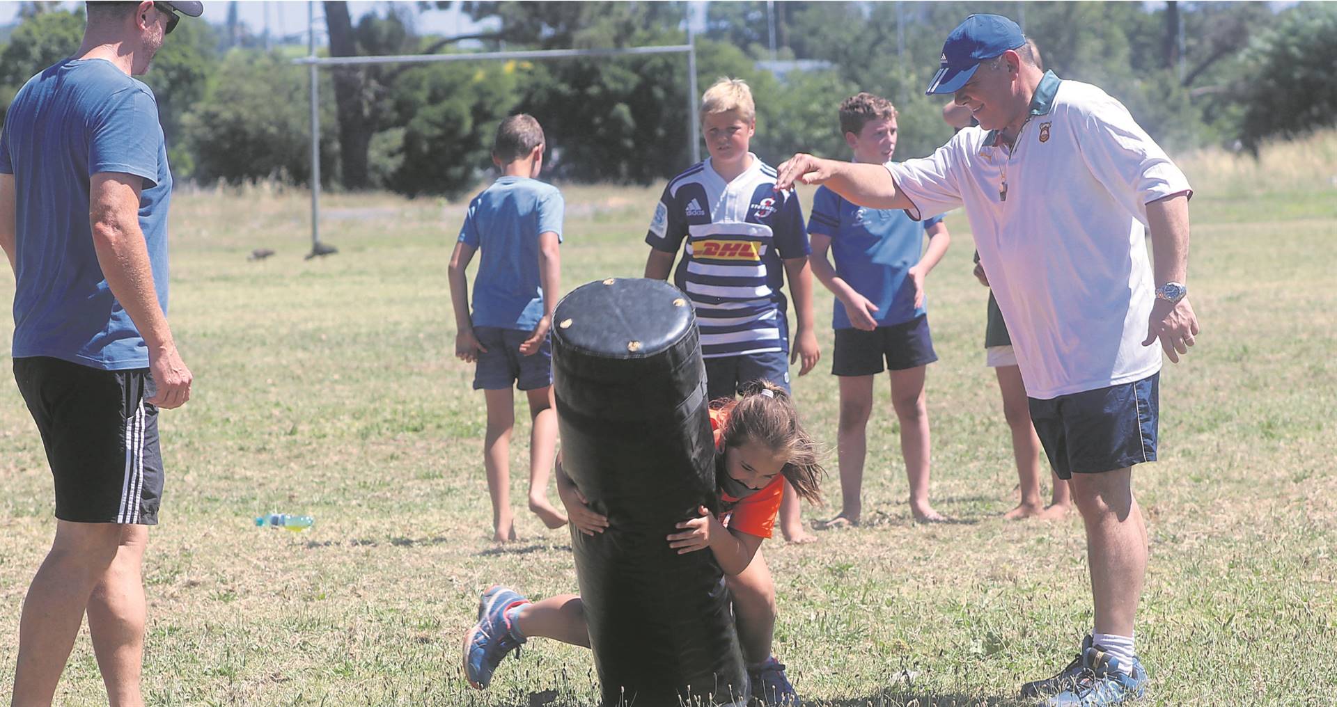 Isabela Mouton van die Laerskool Noord-Eind wys vir die manne hoe om te duik by ’n rugbykliniek wat onlangs op die Boy Louw-sportterrein in die Paarl gehou is. Foto: Lise Beyers