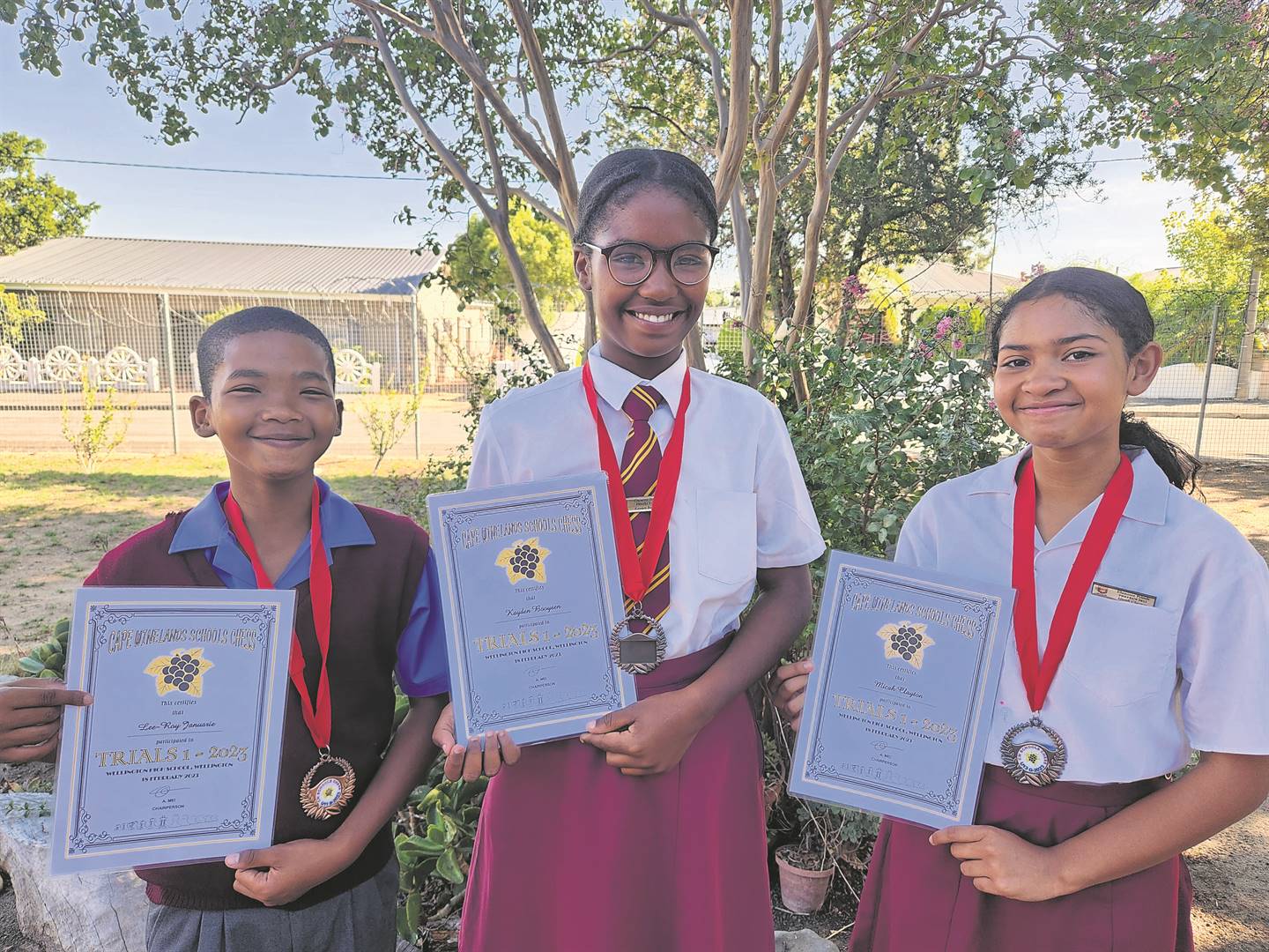 These learners of Ebenezer Primary School obtained outstanding results at the first round of the Cape Winelands Primary Schools Chess trials held at Wellington High School recently. From left is Lee-Roy Januarie (age 11, 8th in the u-11 boys category), Kayden Booysen (age 12, 10th in the u-13 girls category) and Micah Clayton (age 12, 7th in the u-13 girls category). They have all made it to the next round of the trials.