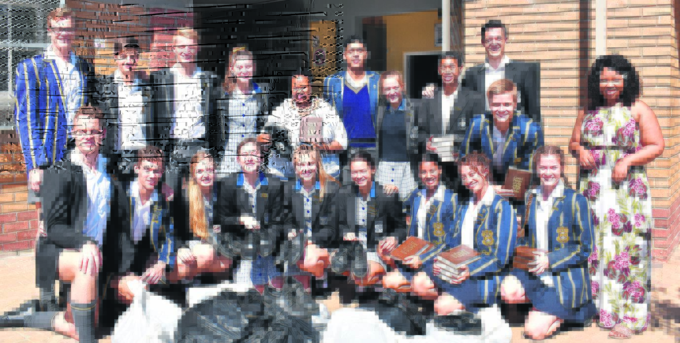 Hugenote Hoërskool se leerlingraad vir 2020 het onlangs meer as 100 paar skoene en Engelse Bybels aan Ihlumelo Sekondêre Skool geskenk.Foto: