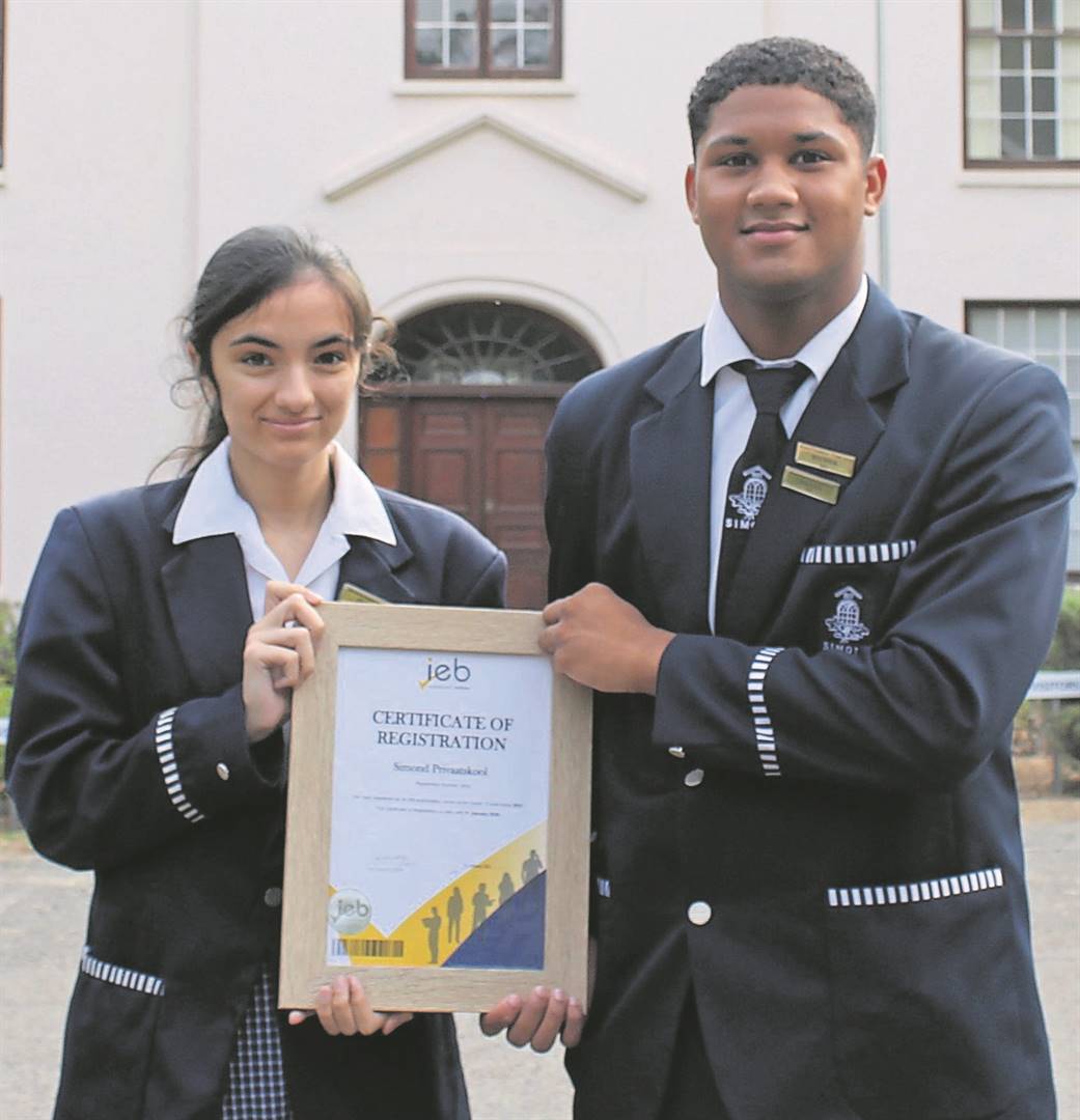 Simond-privaatskool het onlangs suksesvol vir die Onafhanklike Eksamenraad van Suid-Afrika se gr. 12-eksamen geregistreer. Links is Micayla Kerr (hoofmeisie) en Ryan Lackay (hoofseun) met die skool se sertifikaat wat hulle van die eksamenraad ontvang het.