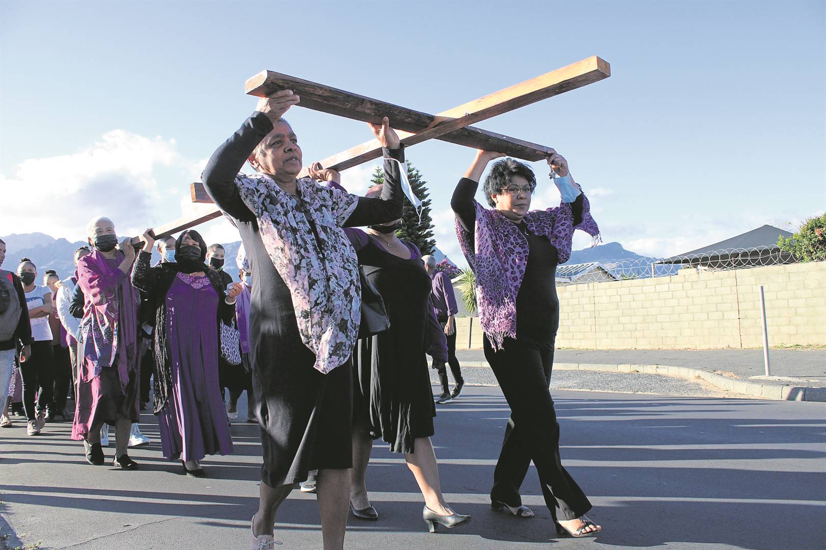 ’n Kerkgorep in Paarl-Oos het op Paas-Vrydag oudergewoonte kruisoptogte gehou as simbool van Christus se kruisiging. Bo stap lidmate van Bethel Congregational-gemeente met hul kruis deur die strate by Shoprite in Paarl-Oos. Die optog het by die kerk geëindig. Foto: Ernest Kilowan