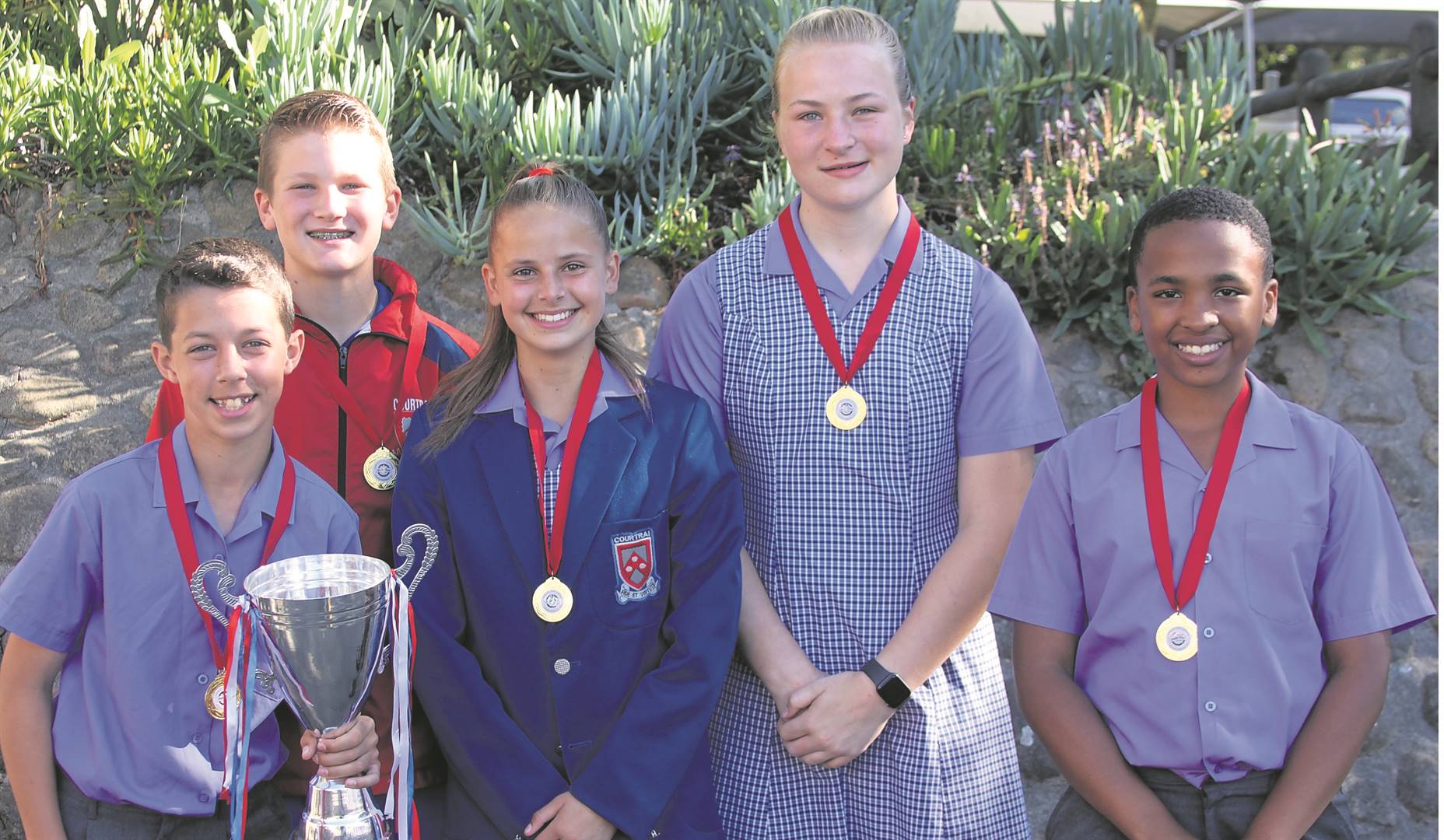 Die Laerskool Courtrai het aan ’n tennistoernooi by die Laerskool Swellendam deelgeneem en as wenners uit die stryd getree. Van links is Leo O’Grady, Samuel Lang, Wanda Keuler, Meliah Corbett en Quin Smith. Afwesig: Isabella Corbett.