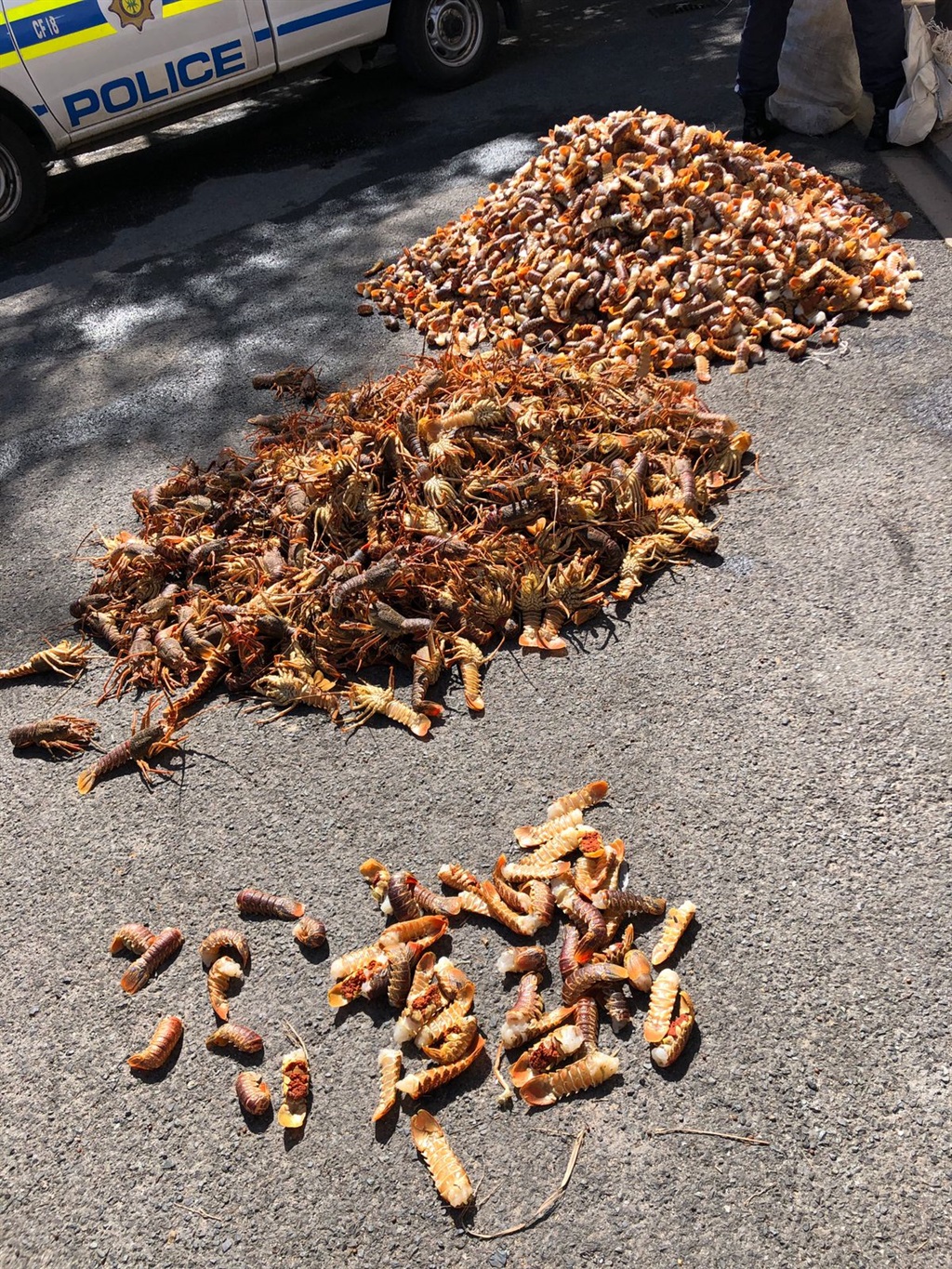 Twee mans is Donderdagoggend in Dirkie-Uysstraat, Franschhoek in hegtenis geneem nadat hul met 5 461 heel krewe en kreefsterte gevang is.