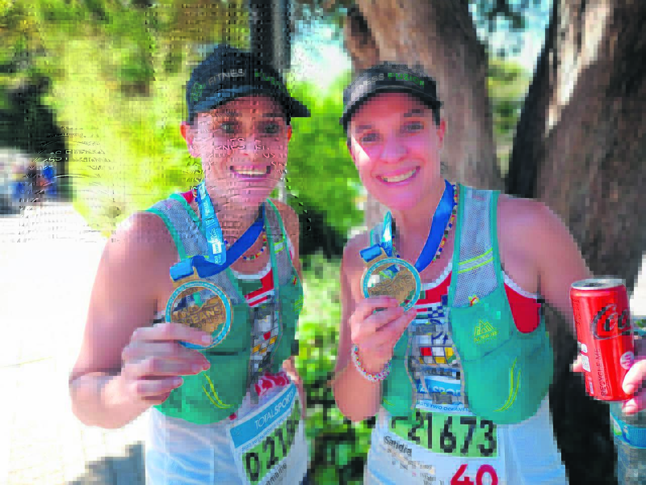 Ná ’n twee jaar lange droogte van georganiseerde langafstandwedlope, was atlete die afgelope naweek verlig toe langasems van heinde en ver weer aan die beroemde Twee Oseane-marathon kon deelneem. Saterdag het die halfmarathonners weggespring, en Sondag was dit die beurt van die uiters uitdagende ultramarathon van 56 km. Links is Paarl se “hardloop-tweeling” Charmaine Viviers en Sandra Nel, wat die ultramarathon suksesvol voltooi het. Charmaine het dit in ’n tyd van 6:16 voltooi en Sandra 6:37. Albei hardloop in die kleure van Paarl-atletiekklub.