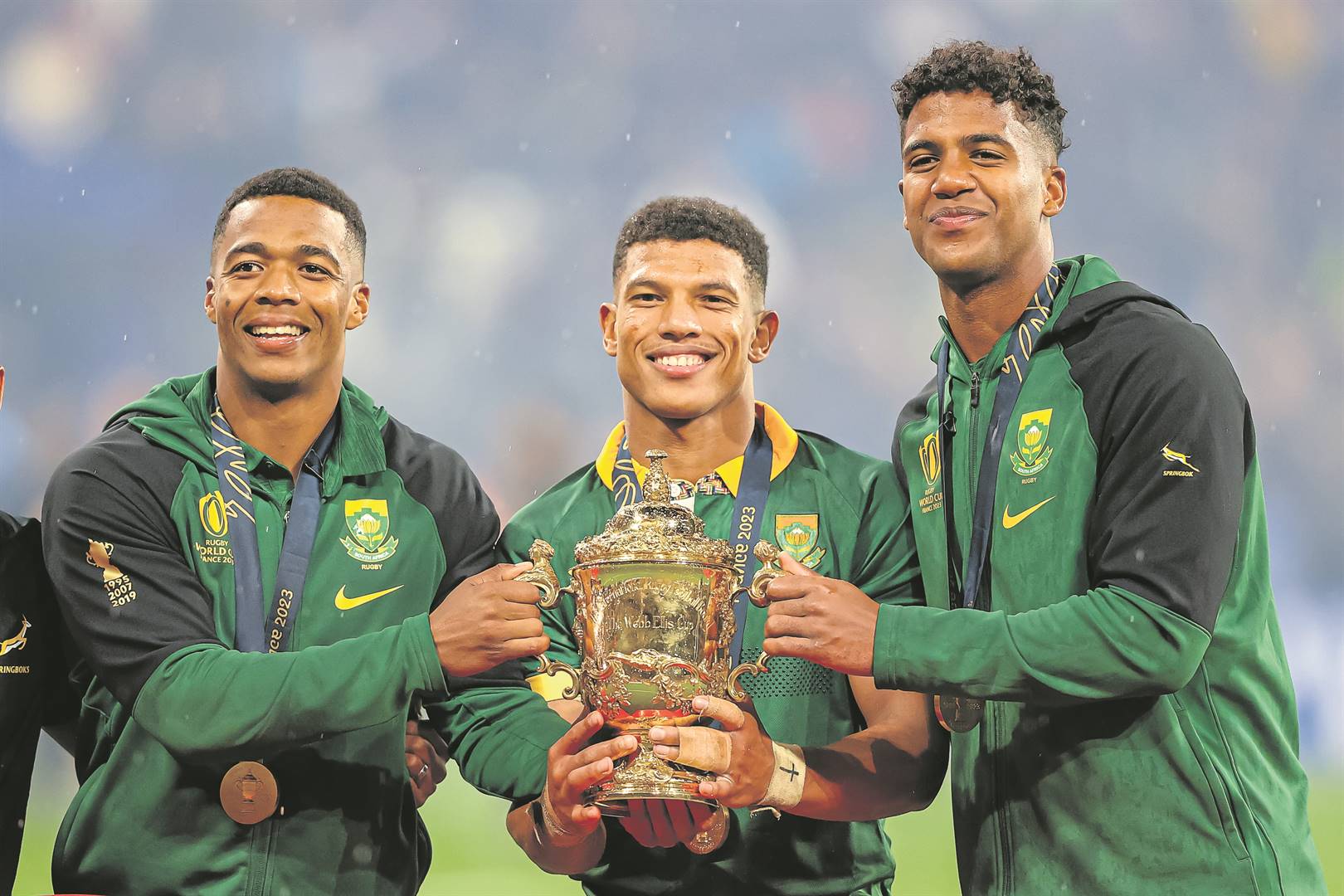 Die Paarl se drie Springbokseuns – Grant Williams, Kurt-Lee Arendse en Canan Moodie – hou Saterdagaand die Webb Ellis-trofee vas nadat die Springbokke die All Blacks van Nieu-Seeland met 12-11 in die eindstryd van 2023 se Rugbywêreldbekertoernooi in Frankryk verslaan het.Foto: Gallo Images