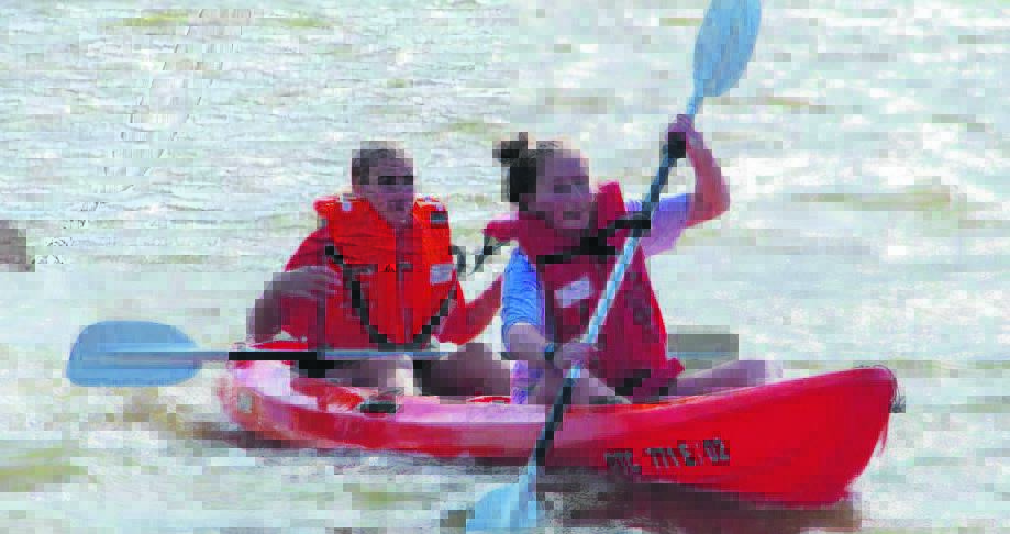 Zani van Zyl (voor) en Eliska Meyer van Paarl Voortrekkers het onlangs die ysige waters van die Theewaterskloofdam vir ’n Winterwaterwerke-Voortrekkerkamp wat daar gehou is, aangedurf. Foto: