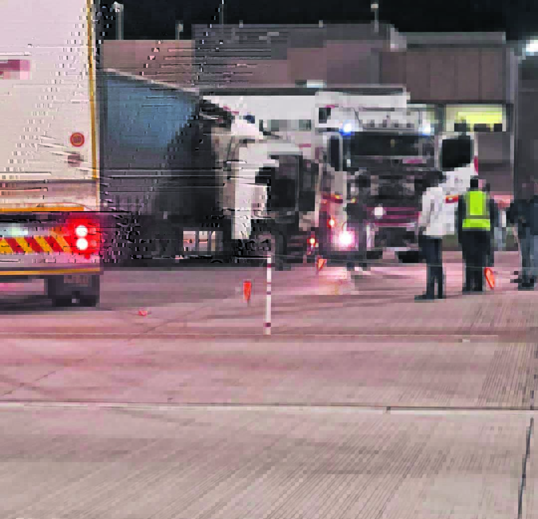 Twee vragmotors het Vrydagaand (21 April) kop-aan-kop gebots by die Hugenote-tonnel se tolhek in die Paarl.