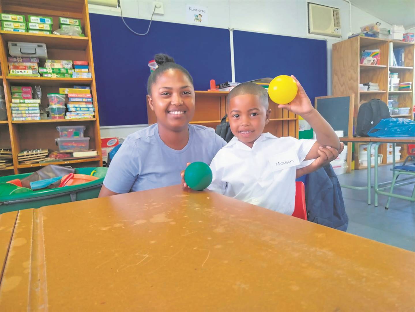 Wellington Primêr se gr. R-leerders is gereed vir 2023! Links is mamma Melvina en Mason Brandt. Mason sê hy kan eenvoudig “nie wag om met my nuwe maatjies te speel nie”.