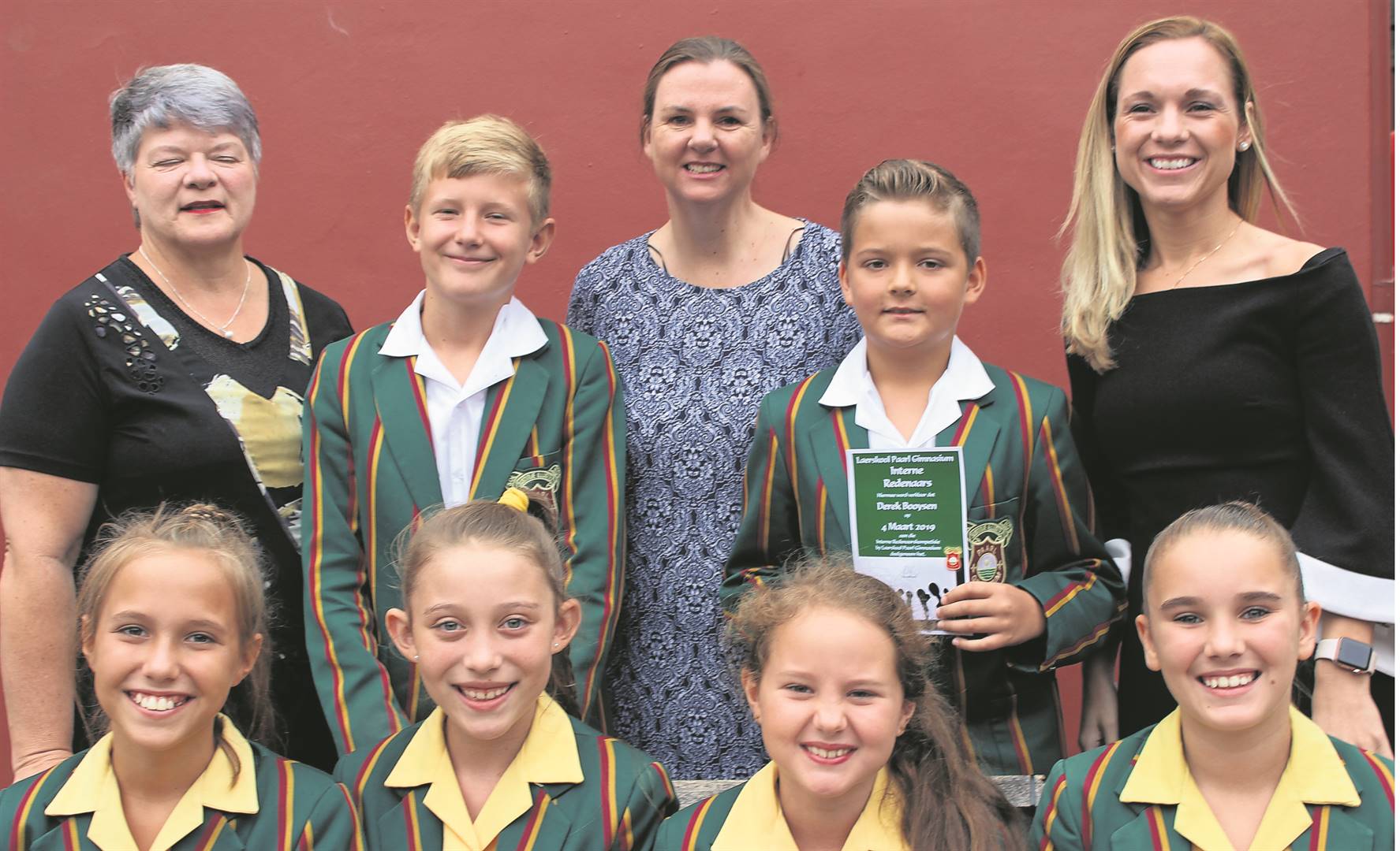 Die Laerskool Paarl Gimnasium het onlangs sy jaarlikse interne redenaarskompetisie gehou. Die deelnemers wat aan die gr. 6-7-afdeling deelgeneem het, is saam met die beoordelaars. Agter is Carolina van der Westhuizen, Mia du Preez en Amanda Anker. Voor is Hanco Botha (vierde), Reynard Buys (wenner), Nicole McThomas (derde) en Gerrie van Deventer (tweede).