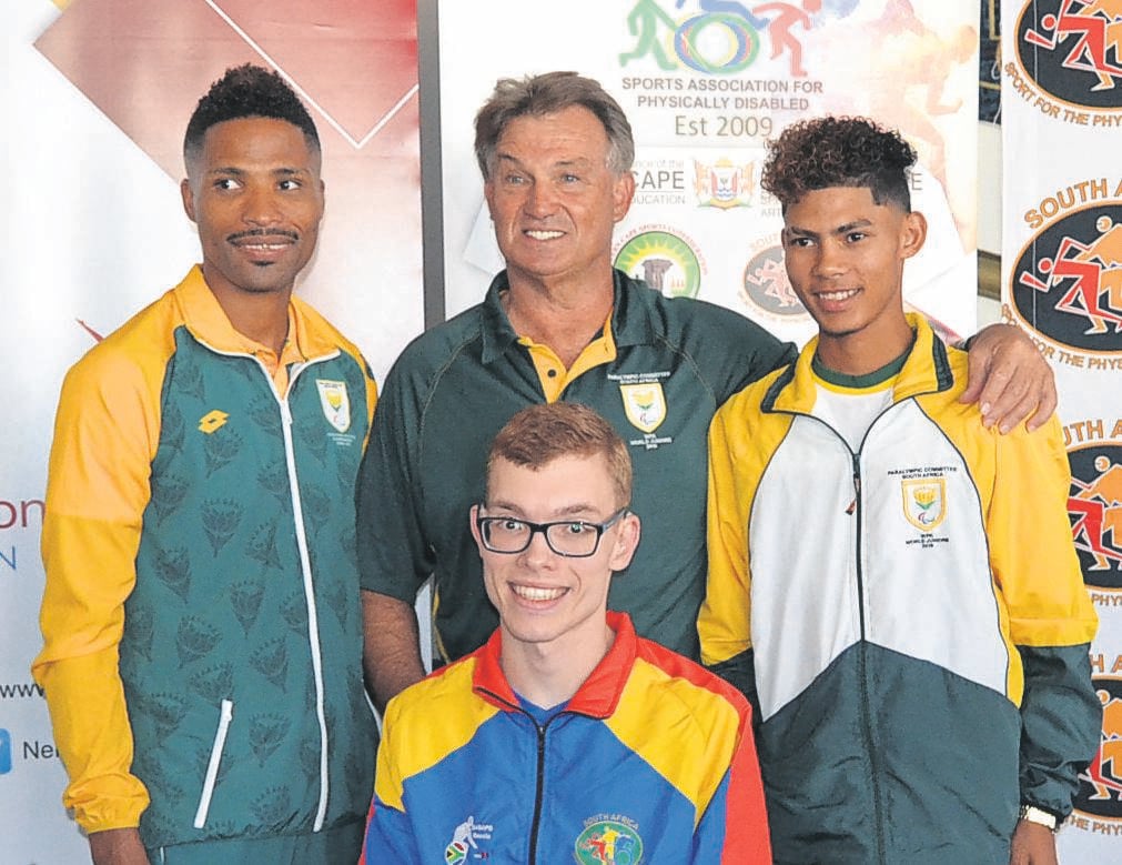 These athletes will soon compete at the Toyota National Sport Championships for the Physically Challenged. From left are Jaco Smit, former Paralympic gold medallist, Michael Louwrens and Sadha Felix. In front is Brett Dakin. Photo:CANDICE BEZUIDENHOUT