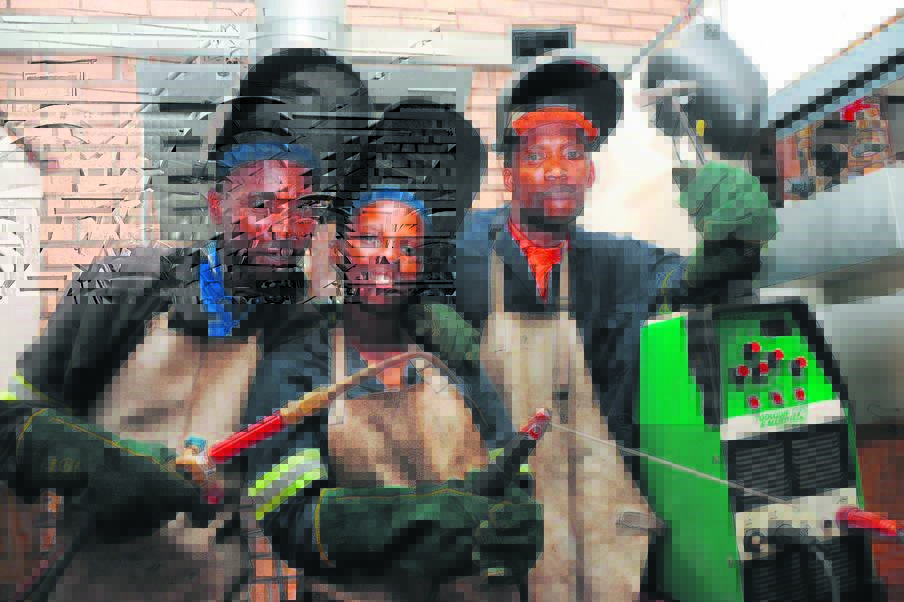 With the assistance of the Coega Skills Development Centre, Kwayiyo Mavuso, Lusanda Marwalana and Mzoleni Kosana are part of the learners benefiting on the Shielded Metal Arc Fillet Welding Programme. Photo: SUPPLIED