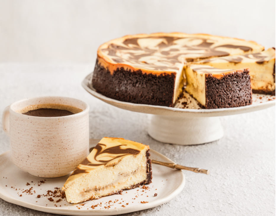 4. Scoop ¼ cup of the cheesecake filling into the bowl with the Douwe Egberts Ristretto Style instant coffee and stir to combine. Tip half the remaining filling onto the chilled crust and smooth the surface. Dollop half of the coffee filling over these cheesecake filing in the pan and use the end of a chopstick to gently swirl. Repeat with the rest of the cheesecake filling, followed by the rest of the coffee filling.