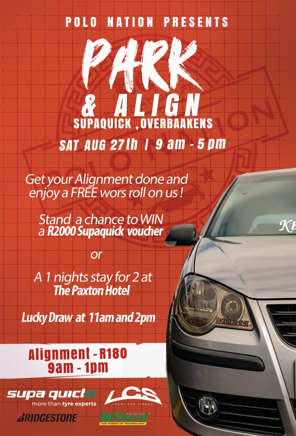 Park and align: Polo Nation presents a park and align at Supaquick Overbaakens from 09:00 to 17:00. Get your alignment done and receive a free wors roll courtesy of Supaquick Overbaakens. When purchasing your park and align ticket, you could stand a chance to win a R2 000 Supaquick voucher or a one-night stay for two people at The Paxton Hotel. Lucky draws will be done at 11:00 and 14:00. Tickets are R180 – limited tickets available until 26 August. If you are unable to join on the day, be sure to purchase your ticket by 26 August as the ticket will be valid until 15 October.