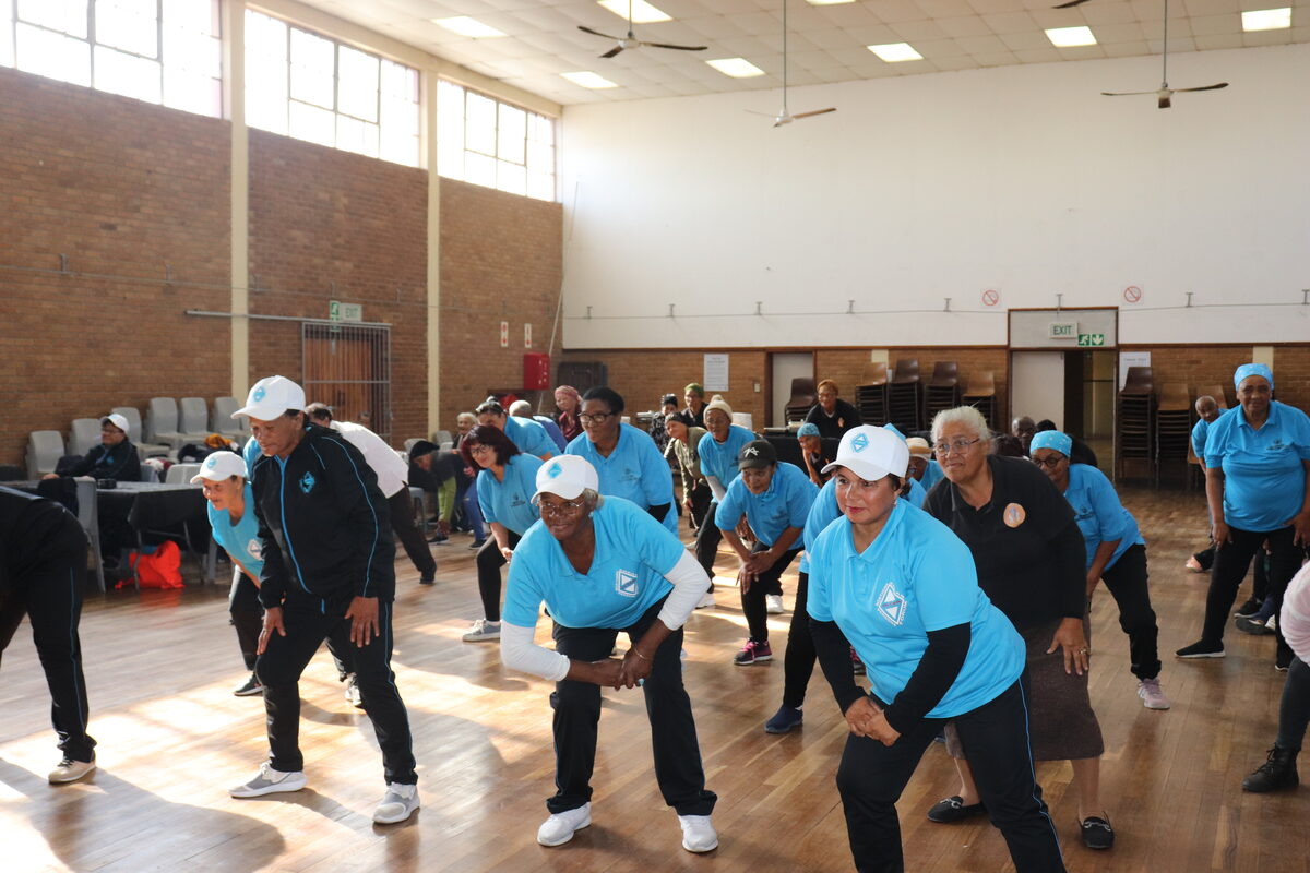 Seniors from four senior citizen clubs (aged from 60 to 80) gathered to participate in stretching and aerobics exercises before watching a play, to demonstrate examples of abuse. Photo: Natasha Bezuidenhout