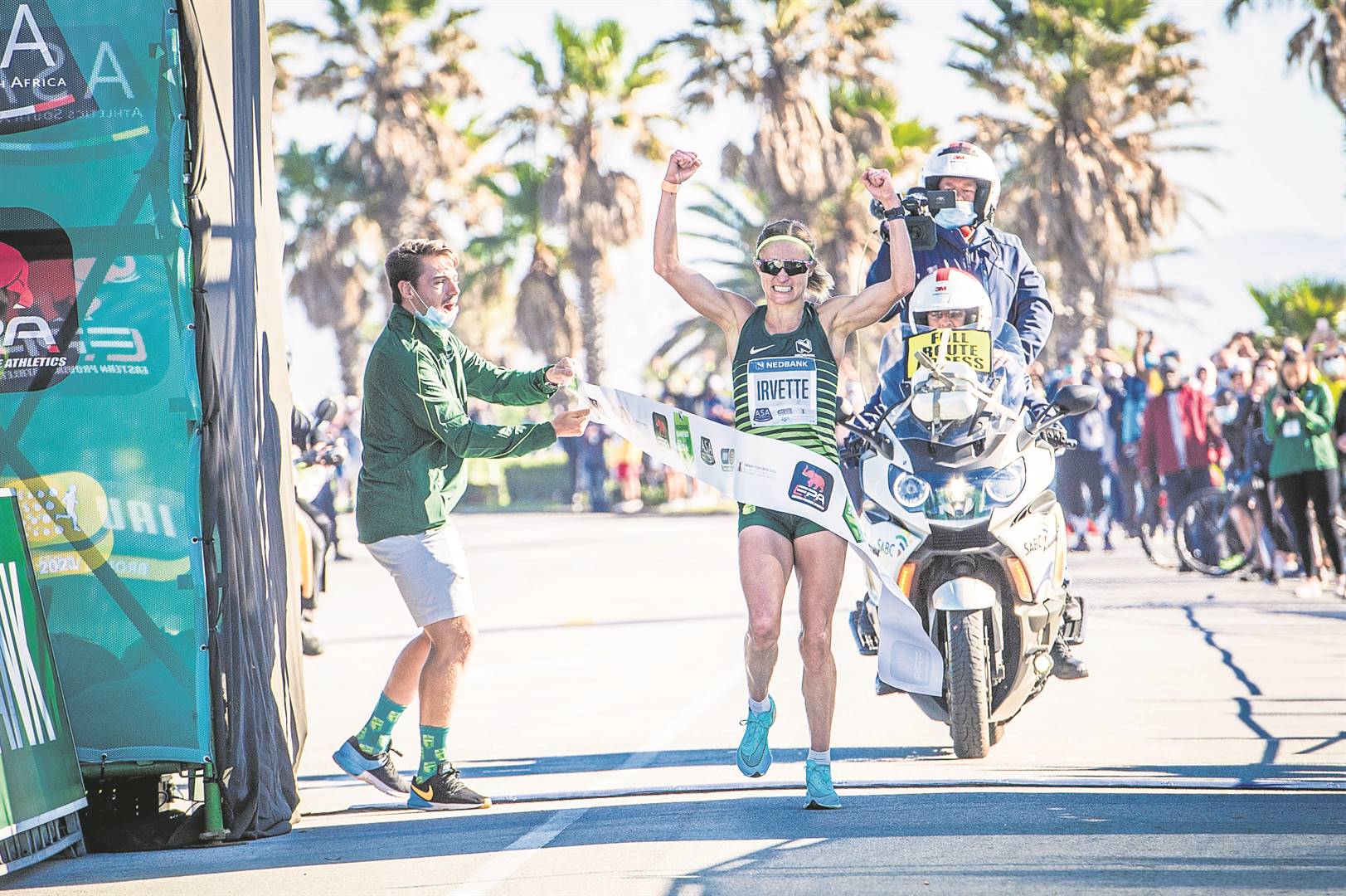 Nedbank running club’s Irvette Van Zyl crossed the finish line at 3:04:23 to be the first South African female to break the Women’s 50km IAU Marathon World Record.Photo: VOLUME-PHOTOGRAPHYBY TOBI O