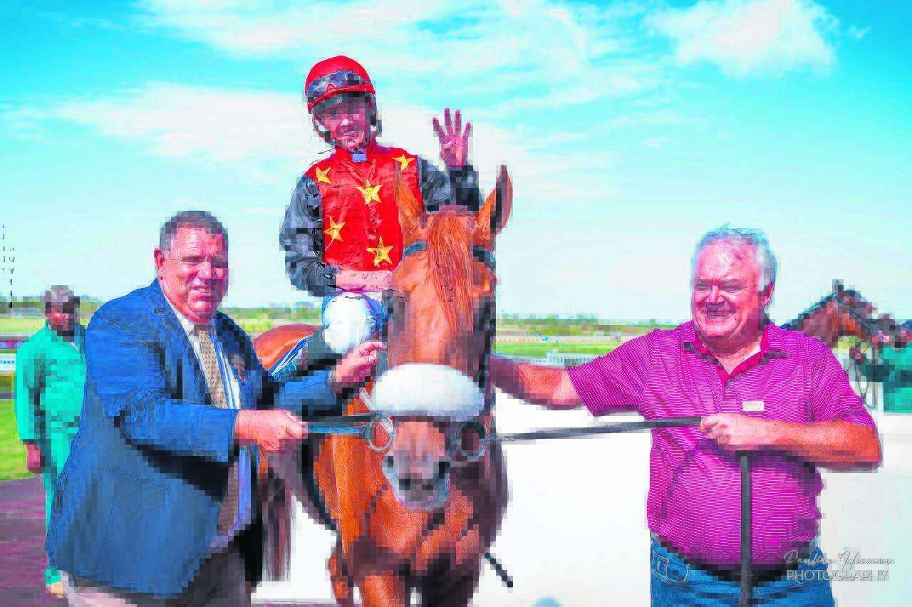 Jockey Richard Fourie indicates he rode four winners as he and United Express are joined by trainer Alan Greeff and owner Andrea Puggia.