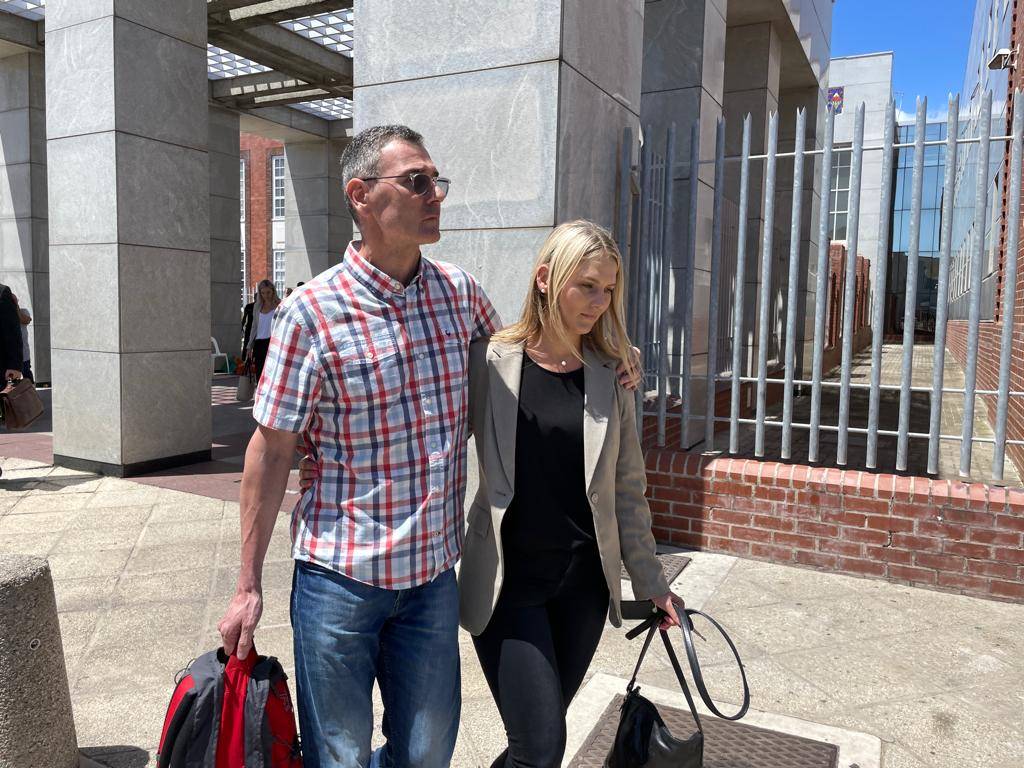 Arnold Terblanche saam met sy oudste dogter, Natalie Nel, buite die landdroshof in Gqeberha nadat hy op borgtog van R1 miljoen vrygelaat is.