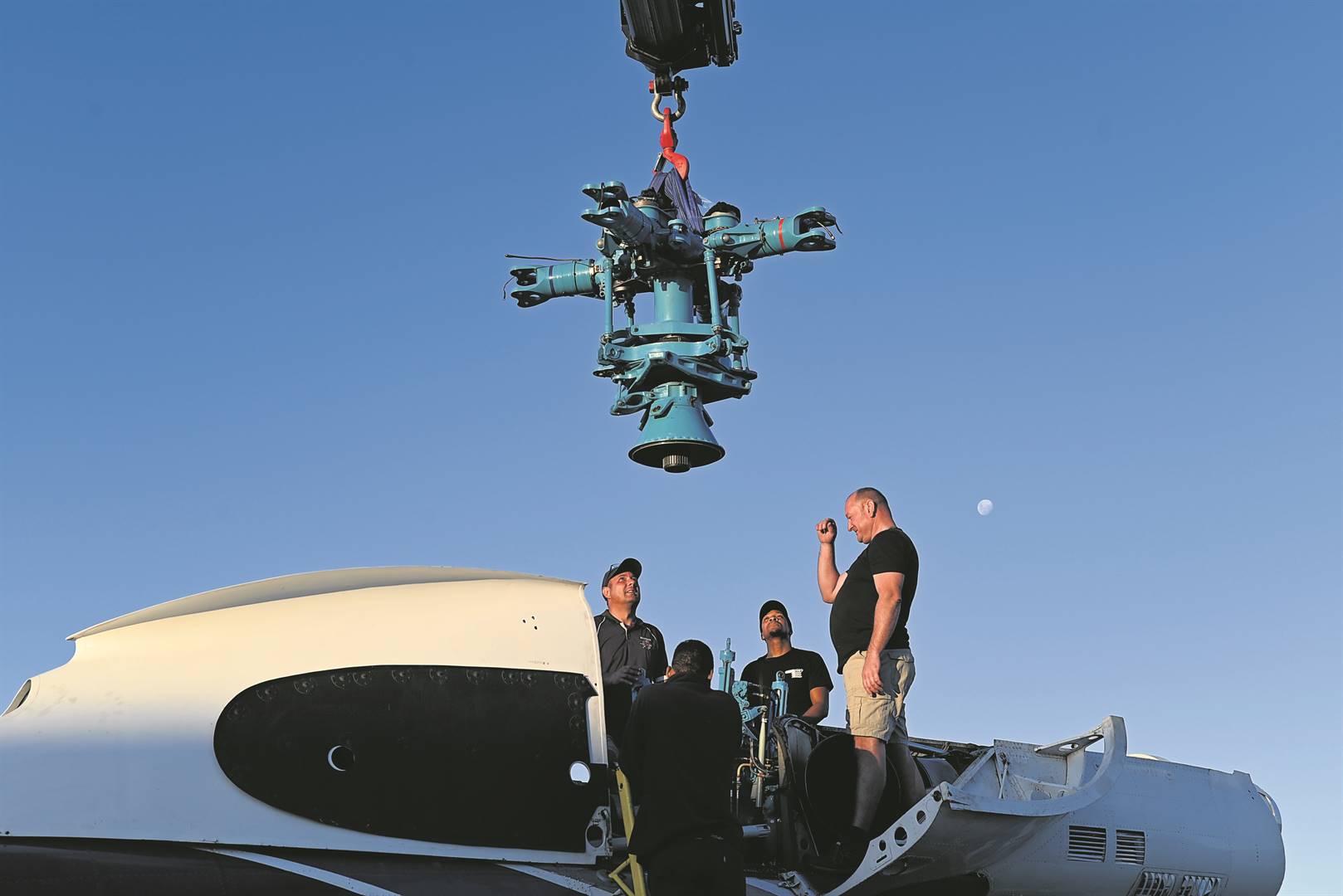 The main rotor head is a multi-million-rand piece of equipment. It weighs 480 kg and needed to be lifted several metres and placed back in position on the Puma chopper.