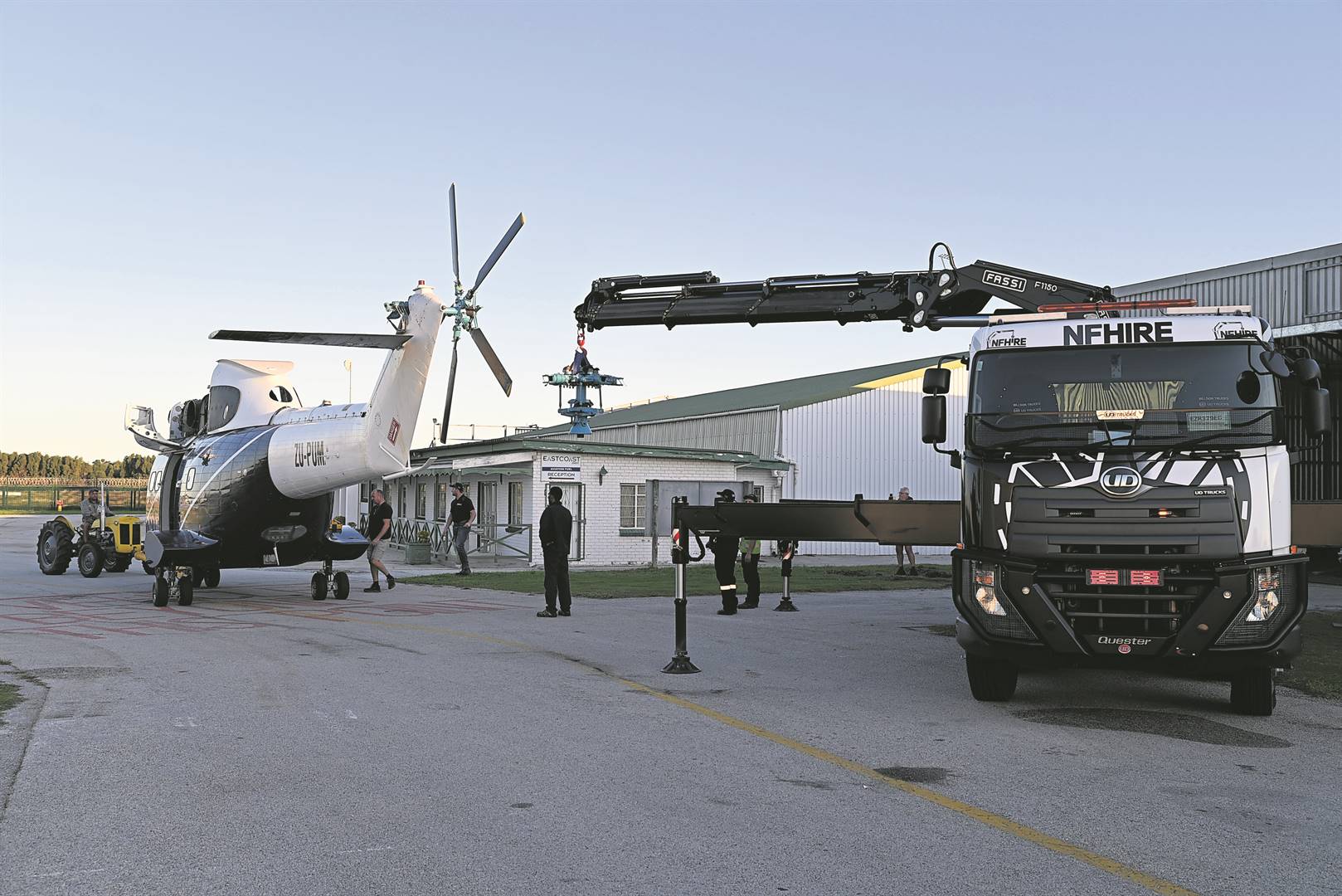 Northfield Engineering was called back the next day to place the four six-metre-long rotor blades in position on the main rotor head. Another crane-truck in the NF Hire fleet, JFK, was used for this job.