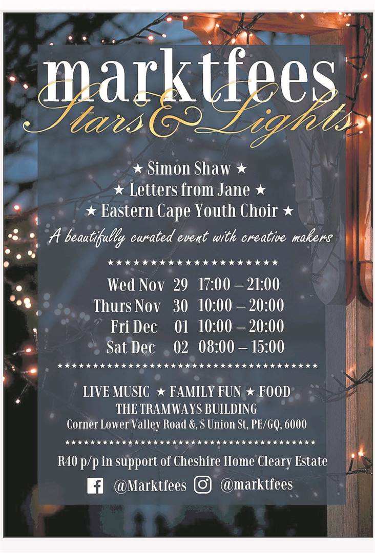 Marktfees will take place in the Tramways Building from November 30 to December 2. Tickets are available at the door at R40 for adults and R30 for pensioners. Both tickets are for multiple entries over these dates and children under 18 can enter free.