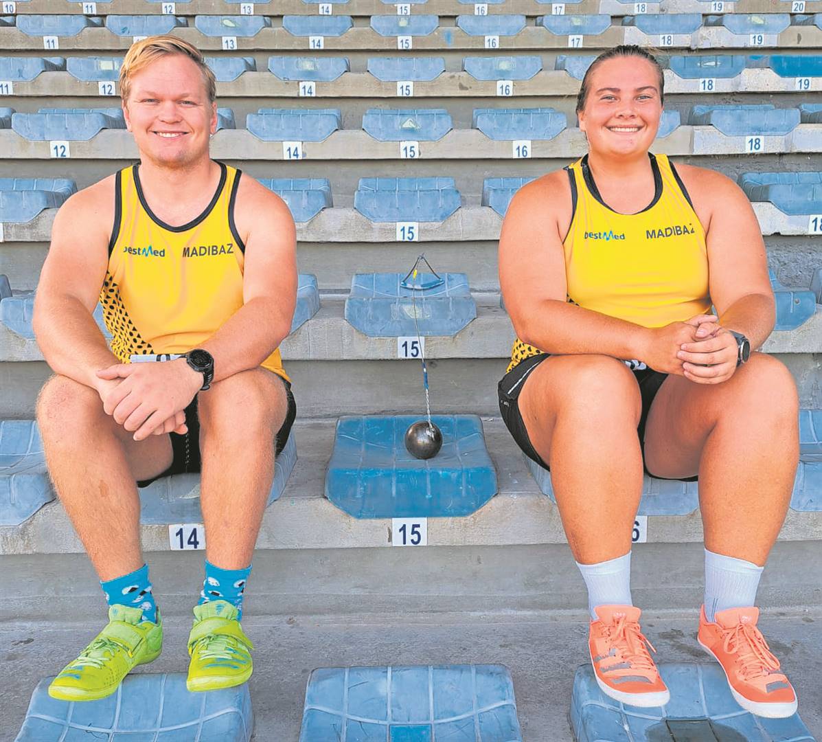 Twee hamergooiers van die Nelson Mandela Universiteit het geskitter tydens die USSA byeenkoms wat vanaf 4 tot 6 April op Stellenbosch aangebied is. Albei het ’n medalje verower. Tiaan Erskine het derde geëindig en die bronsmedalje verower, terwyl Elmé Botha tweede geëindig het en die silwer medalje verower het. Botha het ook ’n silwer medalje by USSA Stellenbosch vir gewigstoot behaal. Erksine het ook by die SA junior kampioenskappe in Pretoria van 21 tot 23 Maart ’n brons medalje in hamergooi behaal. Foto: Verskaf