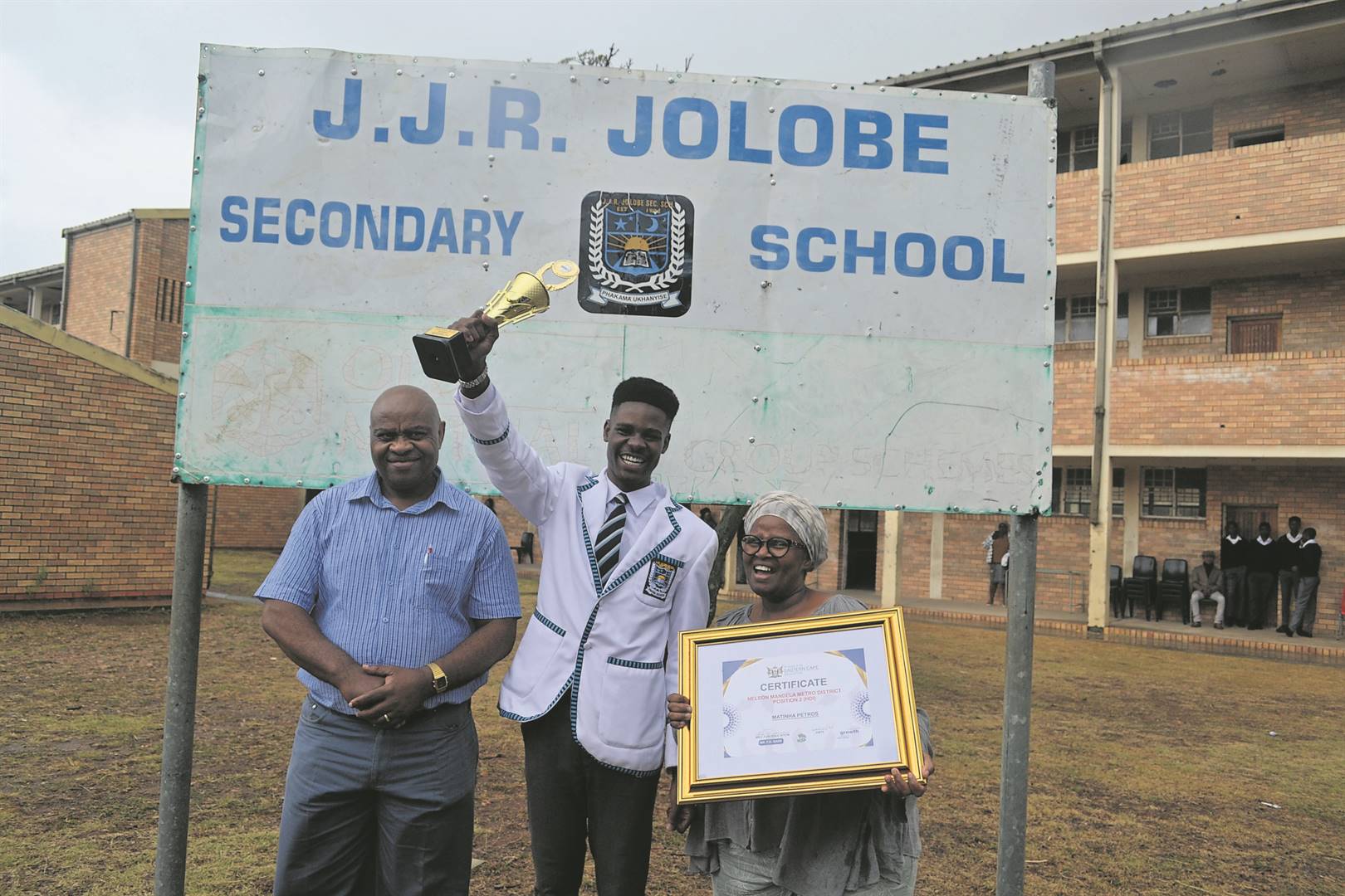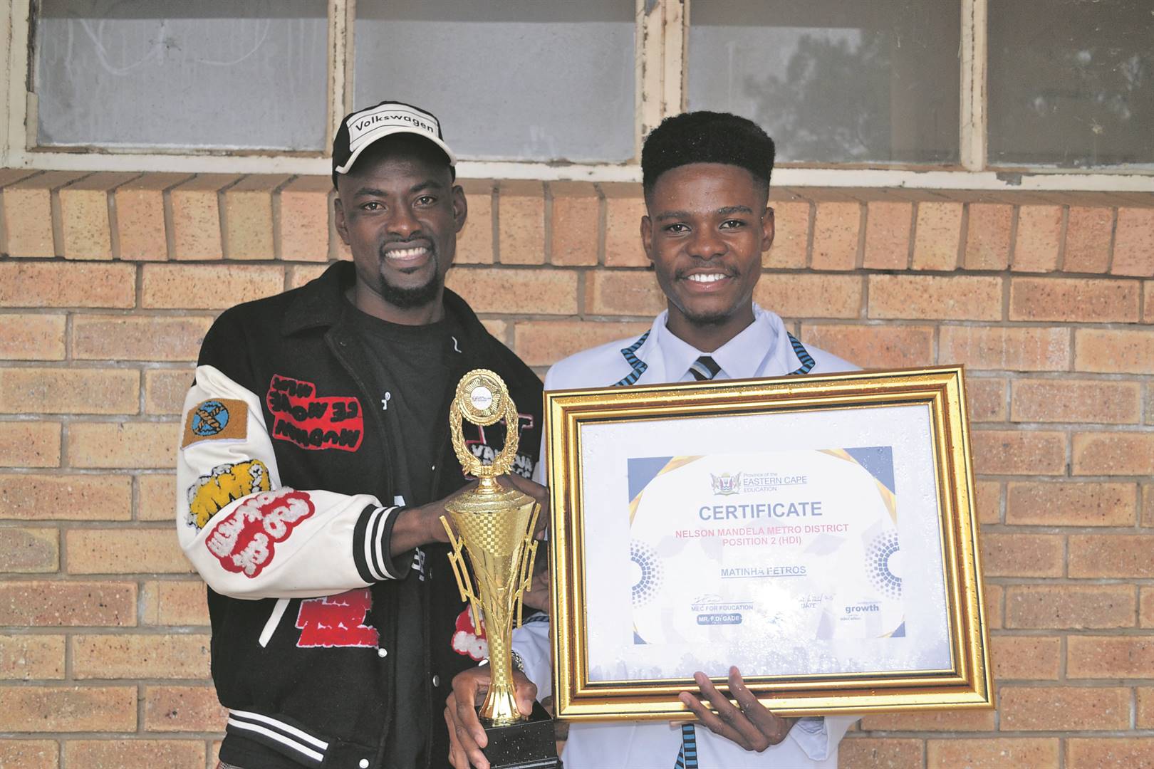 It was as if the rain was not pouring heavily on Wednesday, January 15, at James Jolobe Secondary School in Motherwell, when former learner, Petros Matinha, returned with his trophy and framed certificate in hand.