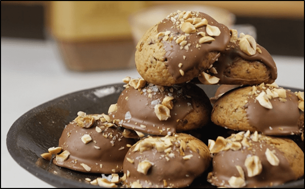 the cooled cookies halfway in the melted chocolate, sprinkle over the hazelnuts