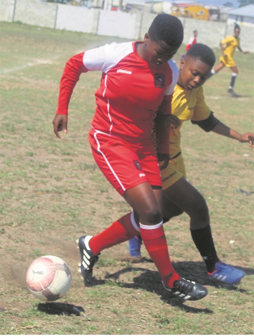 Volcano Ladies’ FC striker, Kamvelihle KV Speelman, protects the ball from Madibaz Football skipper, Ayabulela Abu Ndyebi. photo:SELBY MADIKANE