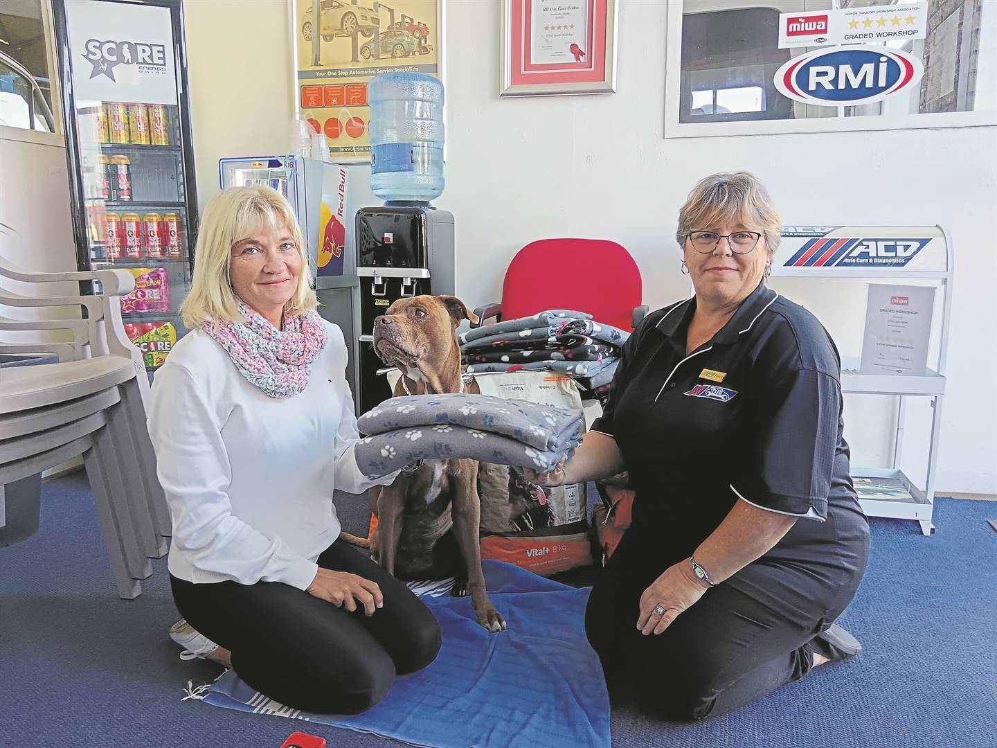 Marizanne Kemp Ferreira, her furry friend Yanka-Kwanita, and Felicity Munro of ACD All Car Care Centre in Sydenham during the recent handover.