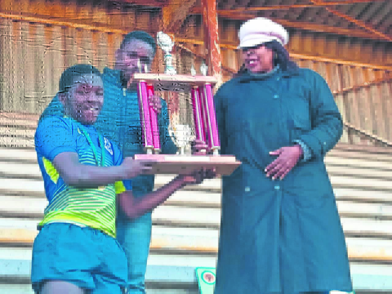 Molly Blackburn Secondary captain Hlubabnisa Festile receives a trophy from Nobesuthu Maqula, with his coach Sonnyboy Mazina standing at the back.Photo: Selby Madikane