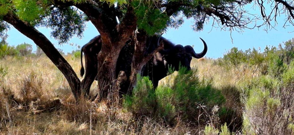 Back in the car, the real fun began. The road was rough, but nothing our โmanly carโ couldnโt manage. First, the climb up a mountain pass with lots of bumps, and when we reached the top, there was a nice flat road where we spotted some buffalo. This was our first time spotting them in the Baviaans. What a special moment! From there, we headed down the pass, and things got even more interesting. Now, weโve done this road many times, but it felt like this time the road was the worst (most fun) yet. Carrying on down the mountain, there are breathtaking views of mountain ranges that make you feel so small in the grand scheme of things.