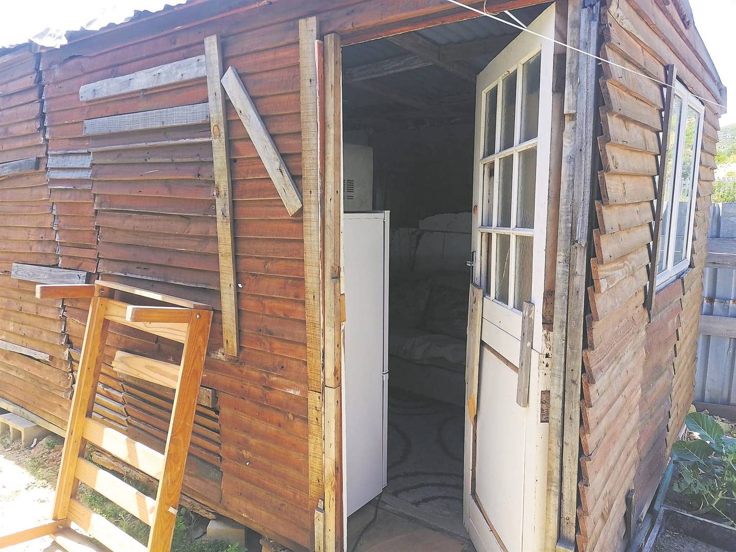 Their home consists of one room divided into a bedroom and sitting area, with uneven floors, different wood panels as walls, a bucket as a toilet and a broken front door.