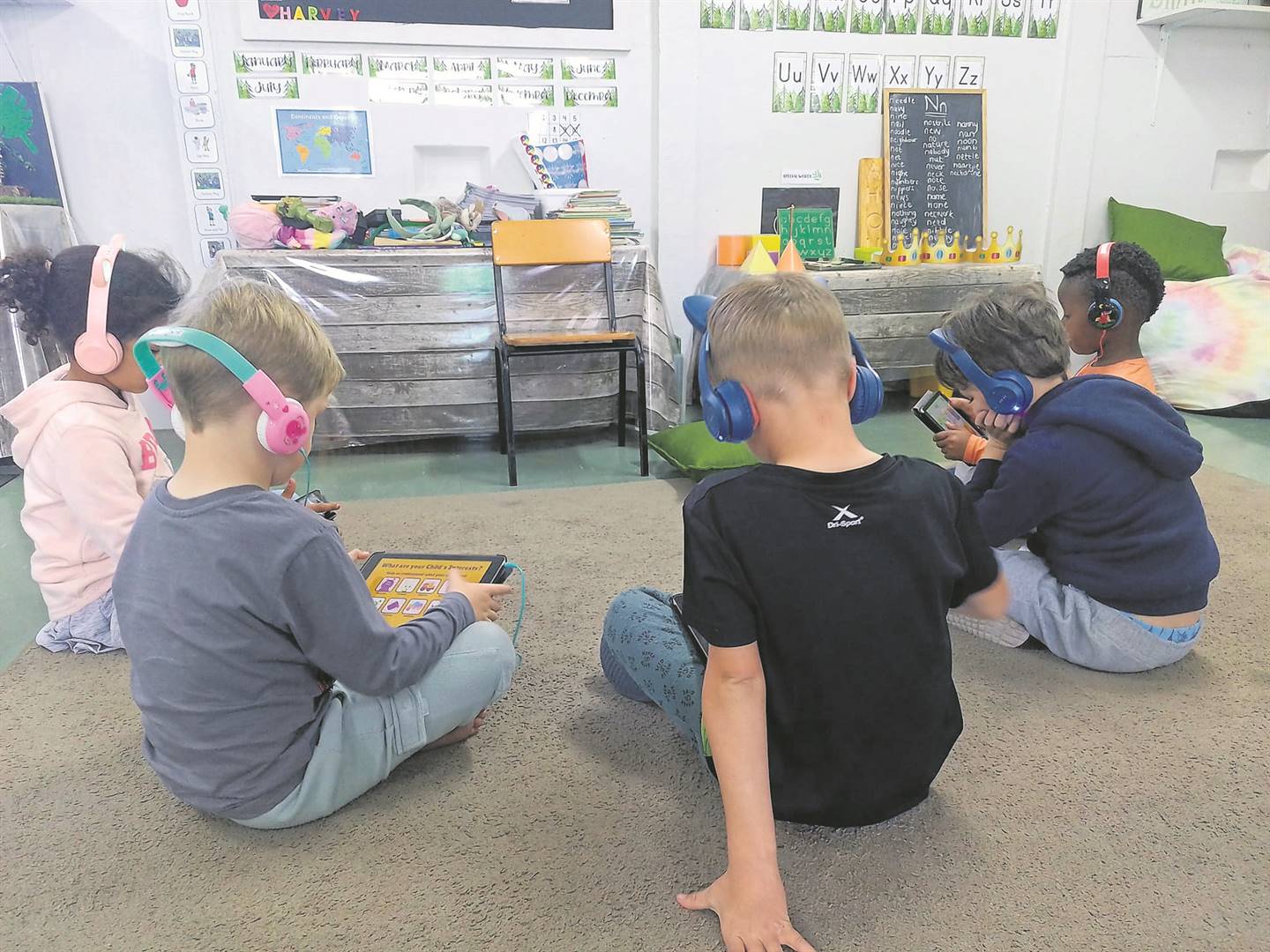 Seated in a circle, Grade R learners at Sun Valley Primary School focus their gaze on individual iPad screens, listening intently through colourful headsets.
