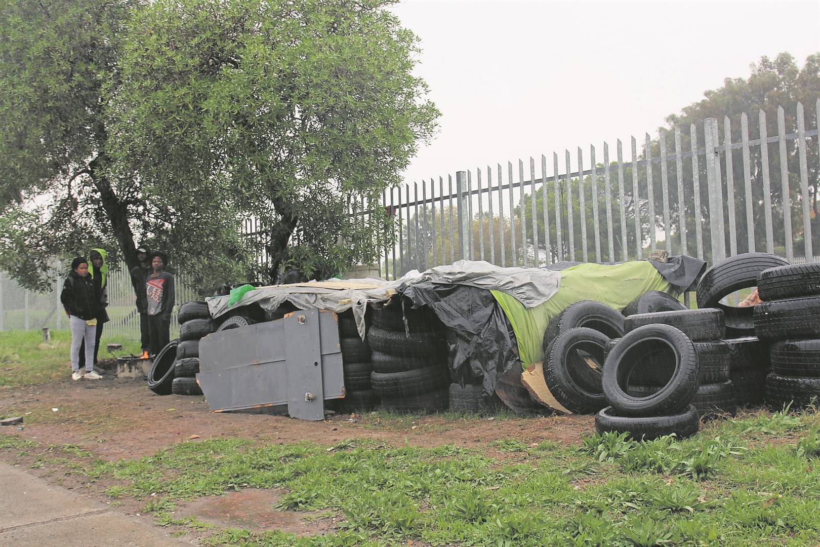 There are currently four adults living in this structure, estimated to be around 3m by 5m, made of tyres, cloth, cardboard, bits of metal sheeting, plastic and other waste materials.