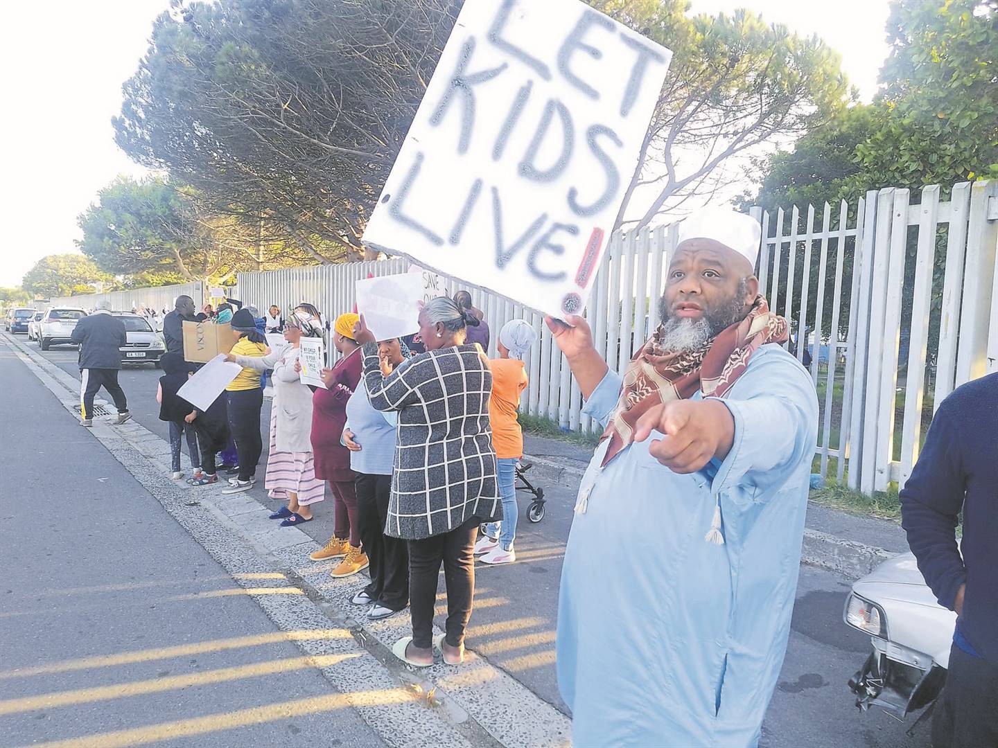 Tiny fingers squeezed through a fence of Parkwood Primary School to hold the placards “Stop hurting us because we are children” and “We want to feel safe” during a picket organised by school teachers on Friday 14 April.