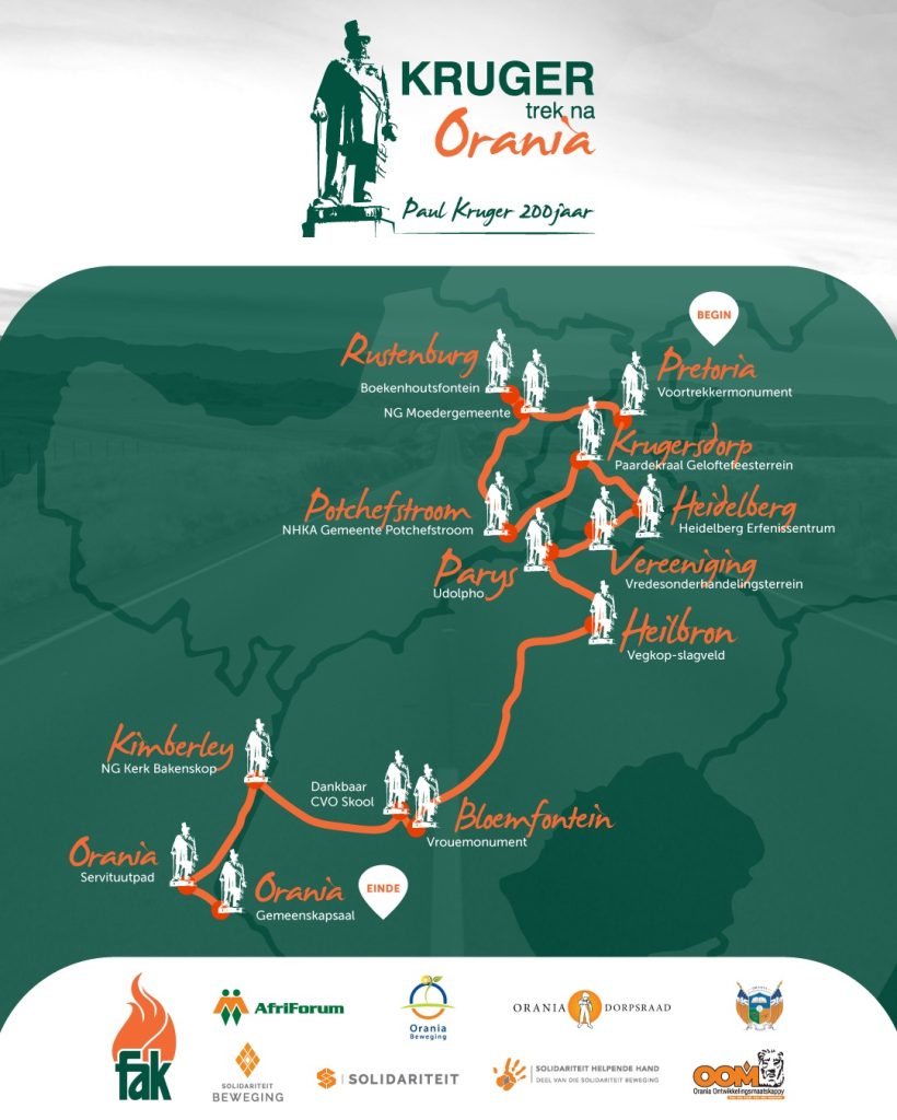 Die groep met die standbeeld van Paul Kruger toer stop van daar op Rustenburg (25 September), Potchefstroom (26 September), Heidelberg (27 September), Parys (28 September), Vereeniging (Maandag 29 September) met ‘n program die middag in Parys, Vegkop by Heilbron op 30 September, Bloemfontein Woensdag 1 Oktober by die Vrouemonument en die middag in Kimberley voor dat dit op 3 Oktober in Orania aankom en op Vrydag 10 Oktober amptelik onthul word.